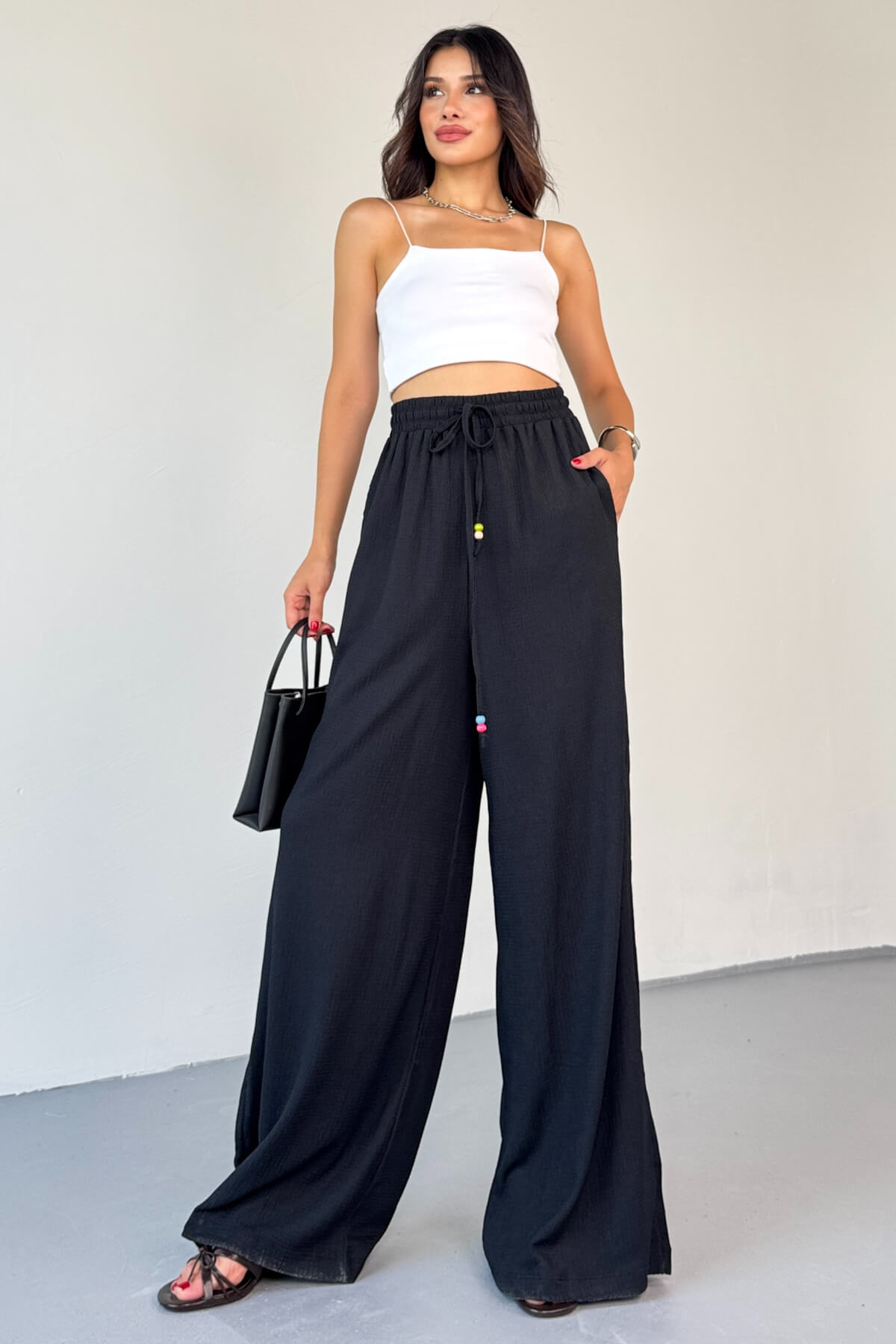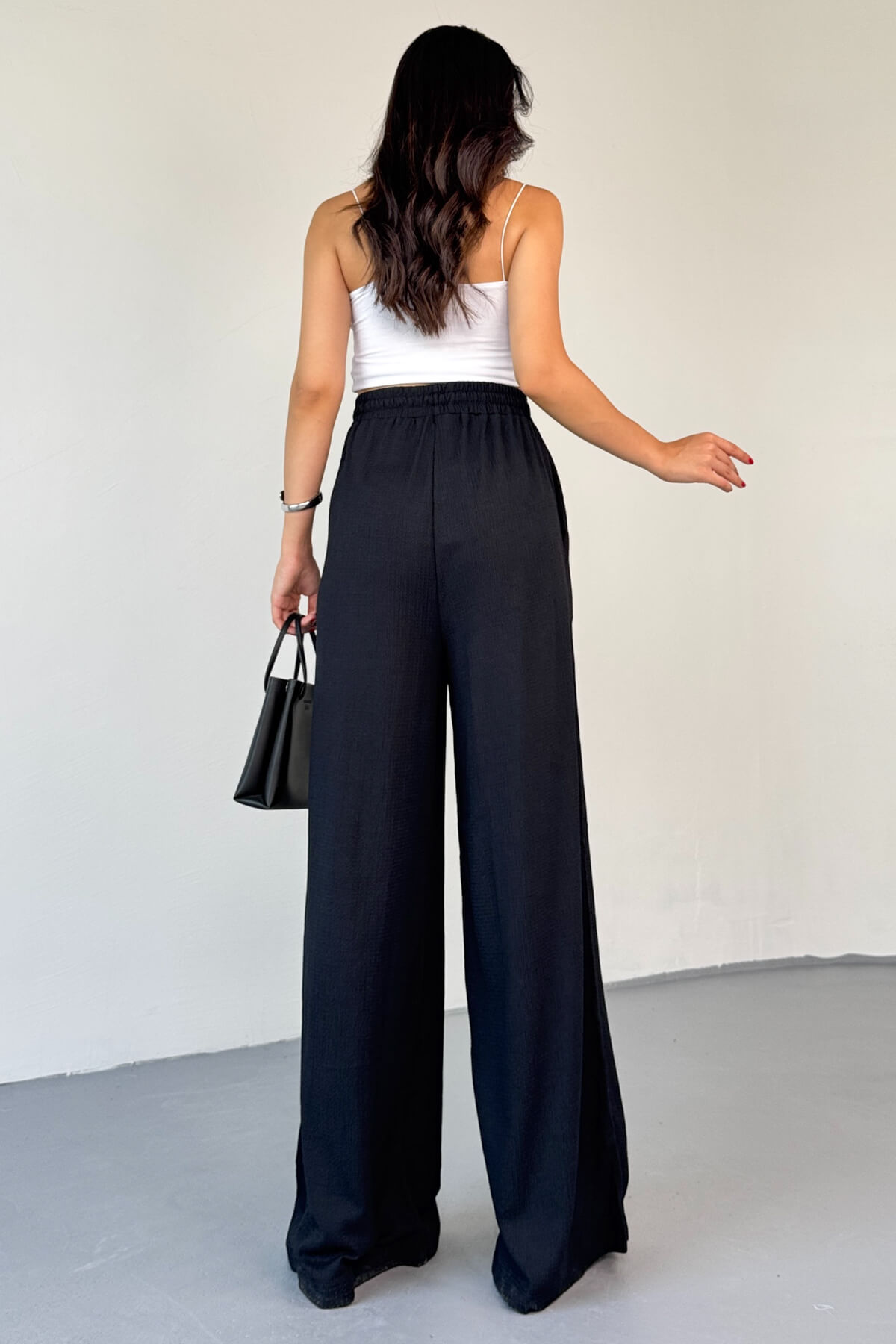 ✔️ Yüksek bel ve lastikli palazzo kesim, hem modern hem rahat