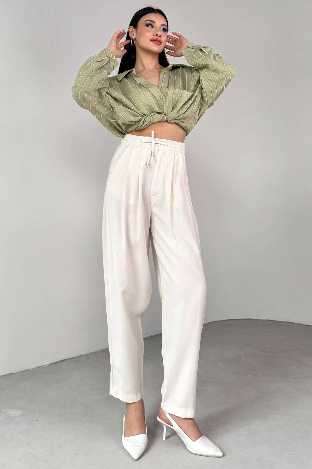 PNT-07416 Krem Bel Bağlamalı Pensli Havuç Pantolon