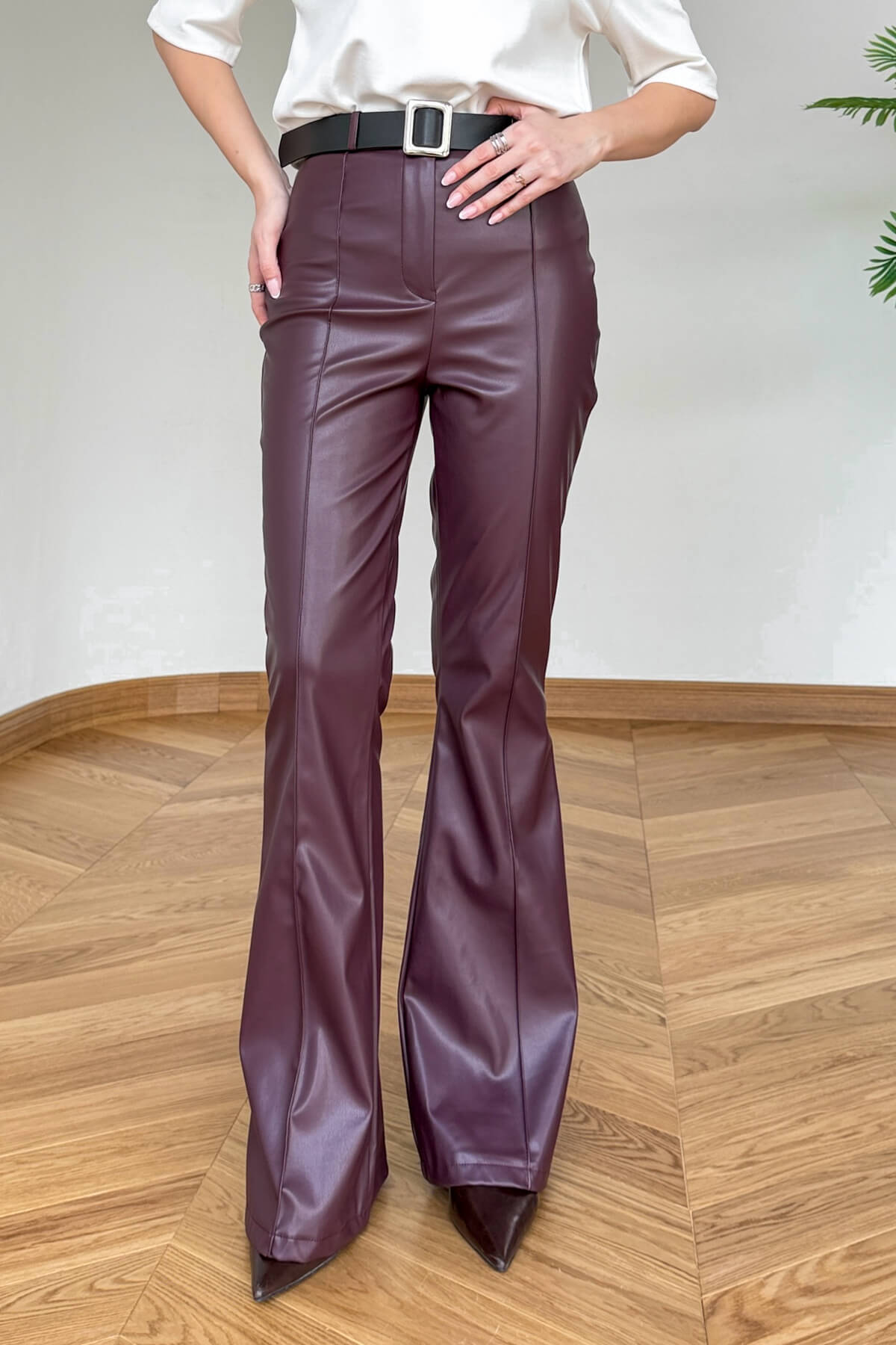 PNT-07424 Bordo İçi Polarlı Kendinden Kemerli Suni Deri İspanyol Paça Pantolon