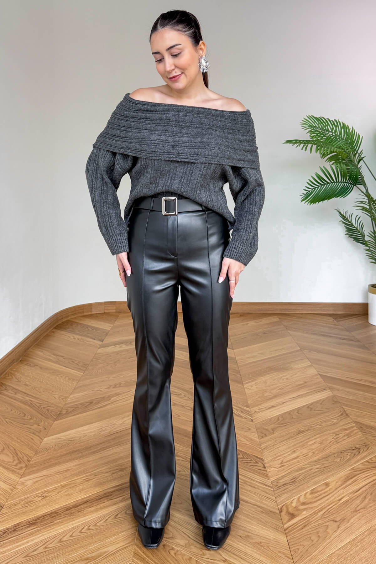 PNT-07424 Siyah İçi Polarlı Kendinden Kemerli Suni Deri İspanyol Paça Pantolon