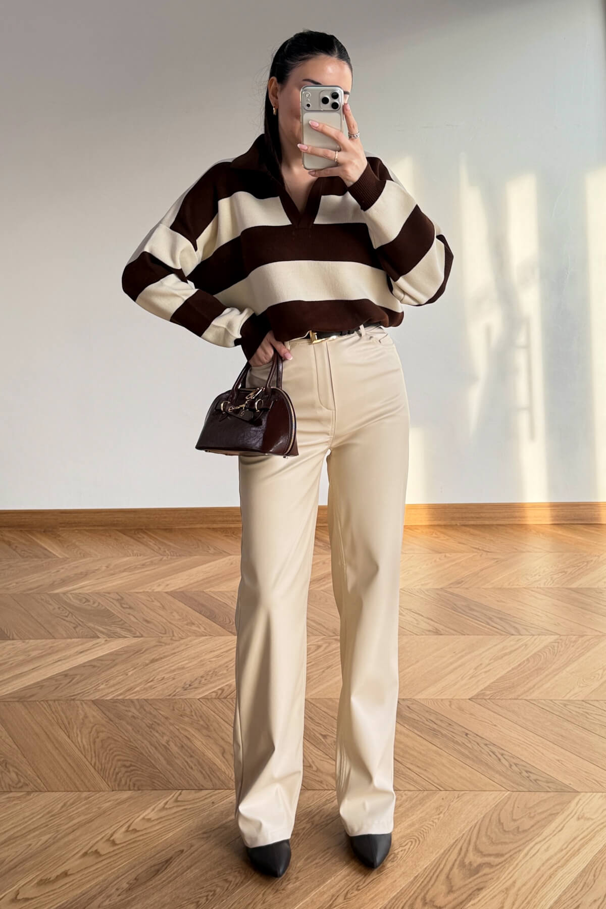 Palazzo kesim, bacak boyunu uzun gösteren akışkan ve geniş paça formu ile şık bir siluet oluşturur.
