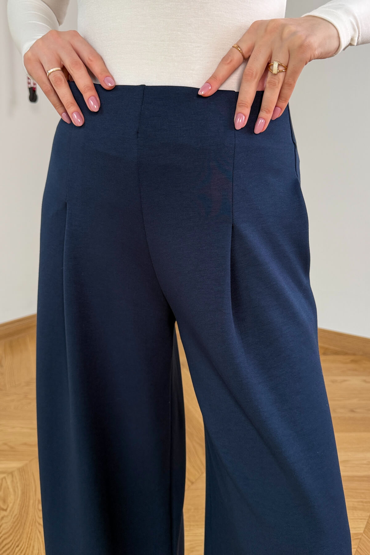 Pamuk ve modal karışımlı, full likralı kumaşı sayesinde üzerinizde yokmuş gibi hafif ve esnek bir his bırakır. 107 cm boy uzunluğu ve bacak boyunu uzatan yüksek bel kesimi, ön kısımdaki zarif orta pilise detaylarıyla birleşerek modern bir silüet sunar. Silüeti bozmayan gizli cepleriyle hem fonksiyonel hem de estetik olan bu parça, gardırobunuzun en kaliteli demirbaşı olmaya aday.