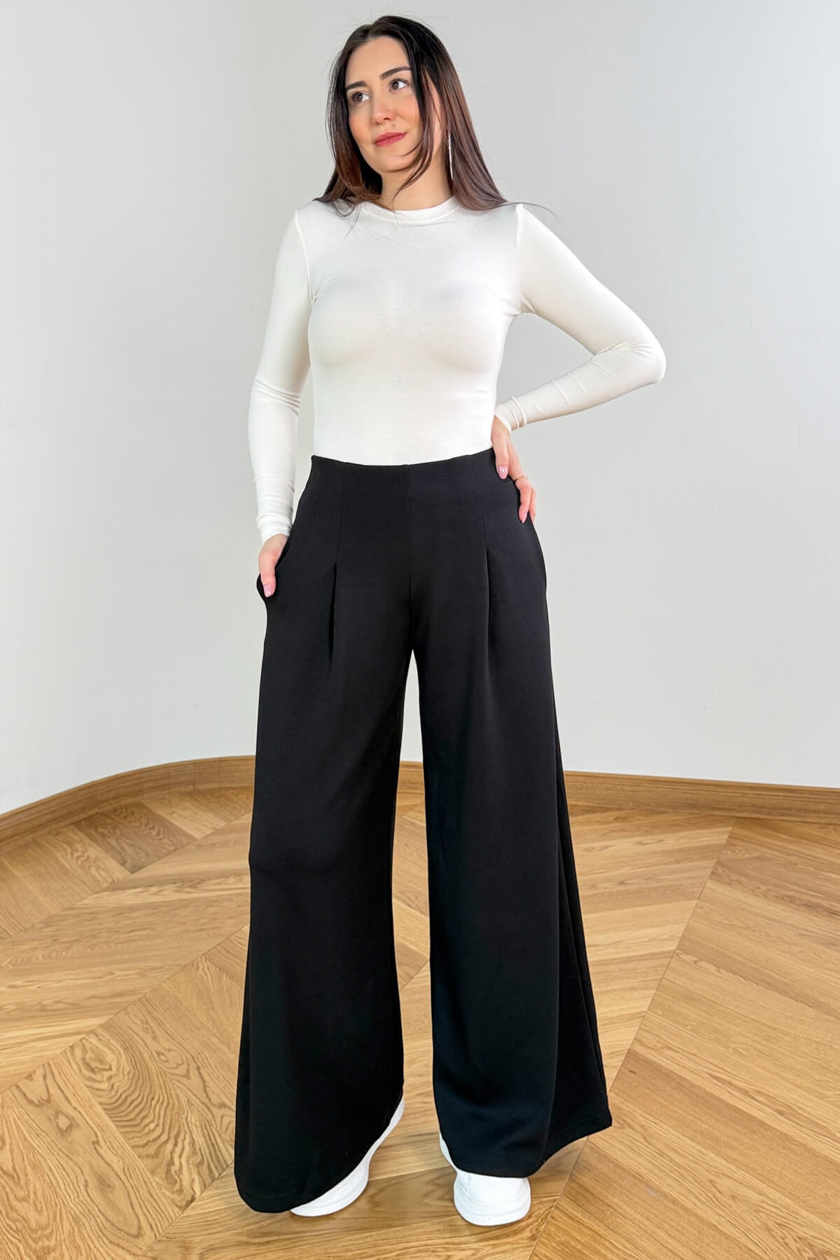 Pamuk ve modal karışımlı, full likralı kumaşı sayesinde üzerinizde yokmuş gibi hafif ve esnek bir his bırakır. 107 cm boy uzunluğu ve bacak boyunu uzatan yüksek bel kesimi, ön kısımdaki zarif orta pilise detaylarıyla birleşerek modern bir silüet sunar. Silüeti bozmayan gizli cepleriyle hem fonksiyonel hem de estetik olan bu parça, gardırobunuzun en kaliteli demirbaşı olmaya aday.