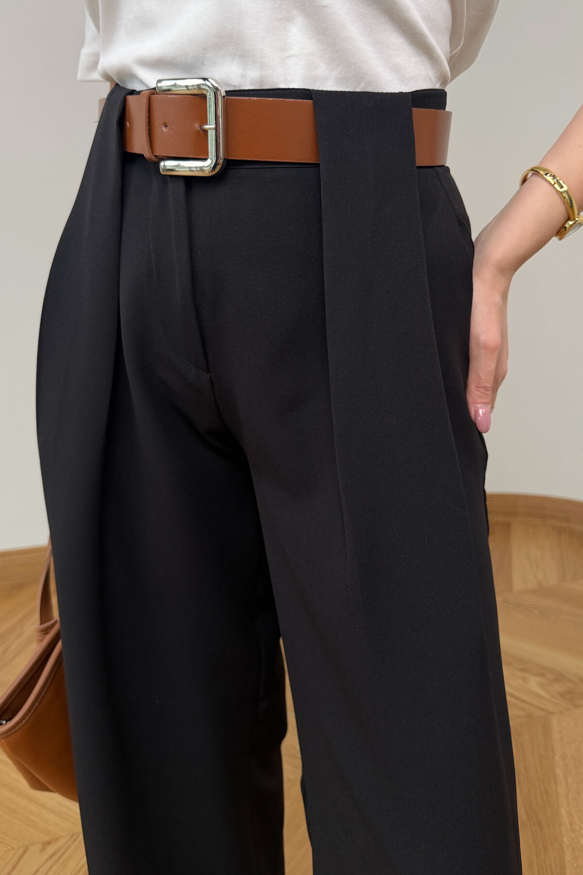 Tasarım Detayı: Bel bölgesine hareket katan pens dikişleri ve şık metal tokalı kemer aksesuarı.