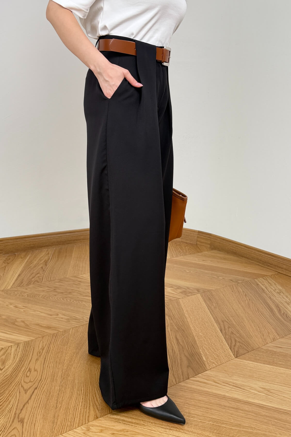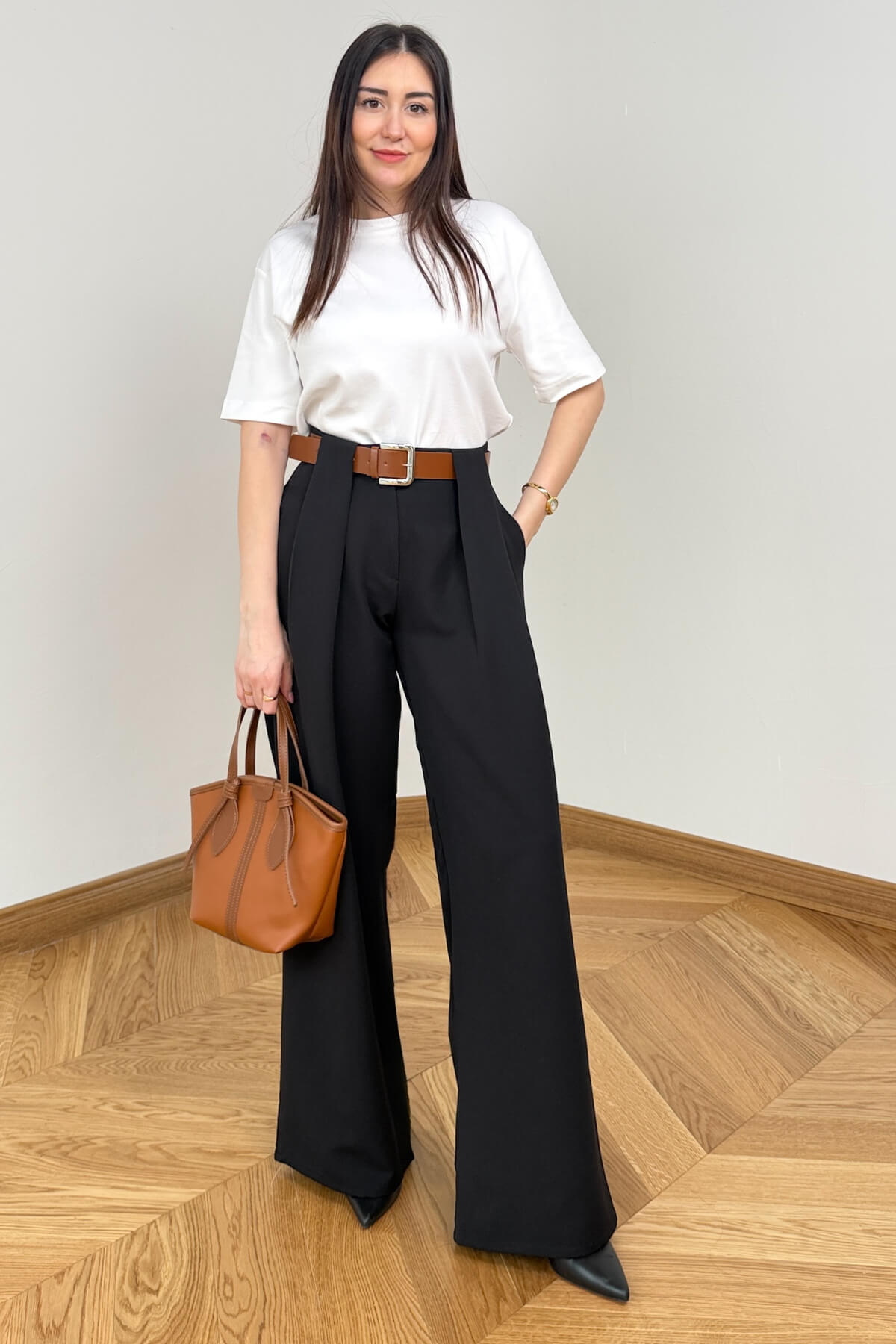 Kesim: Belden tam oturan, aşağıya doğru hafifçe genişleyen zarif yüksek bel kesim.