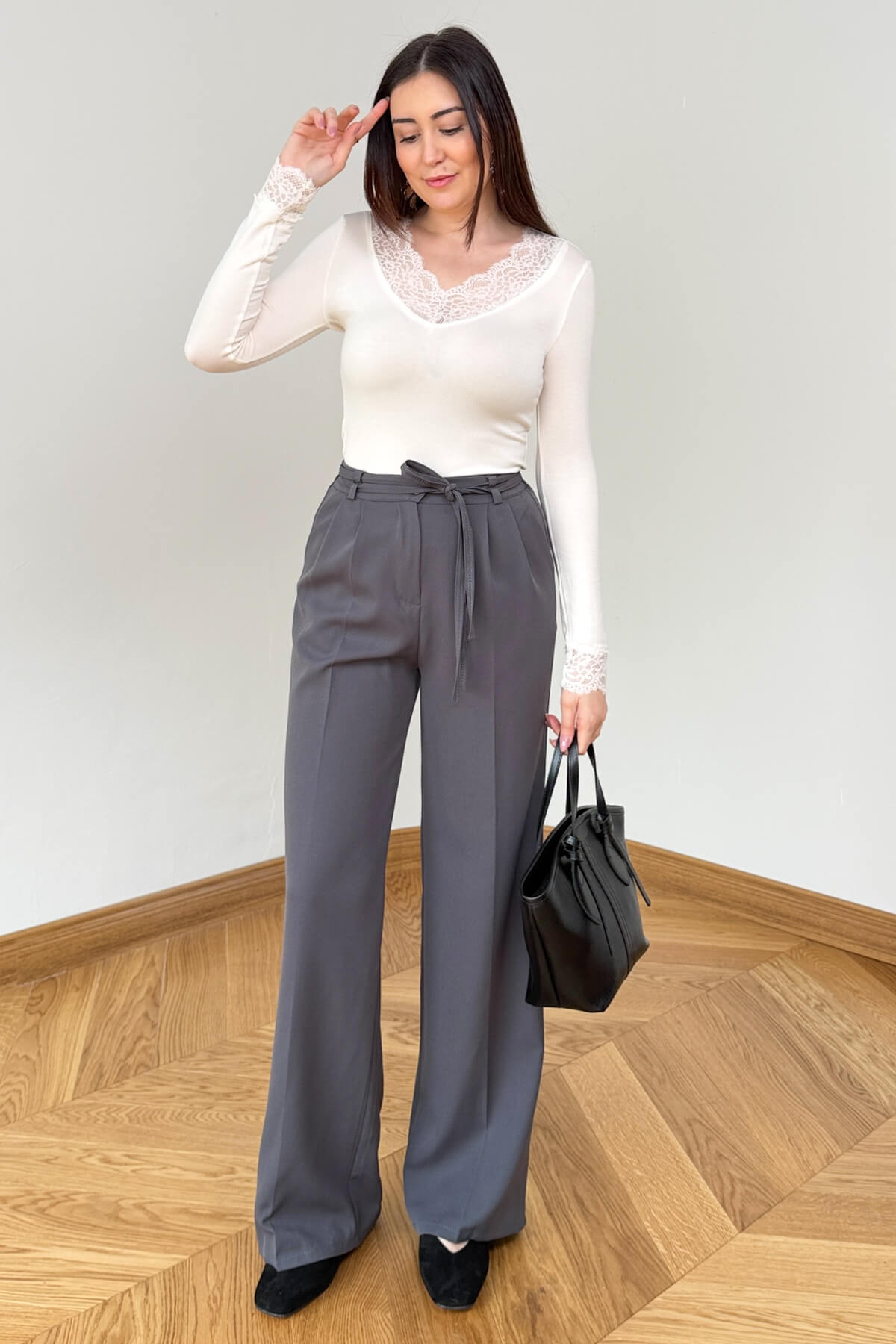 Tasarım Detayı: Bel hattında şık bir fiyonk oluşturabileceğiniz bağlama şeridi ve dökümlü palazzo paça yapısı.