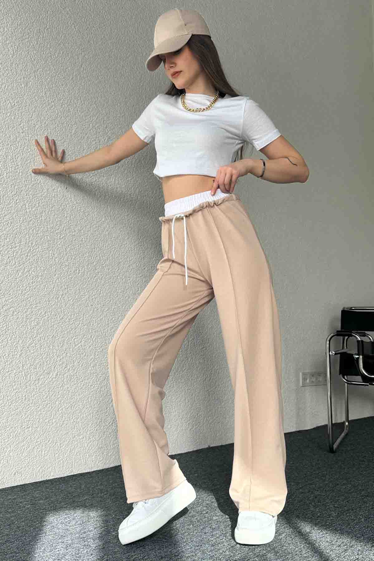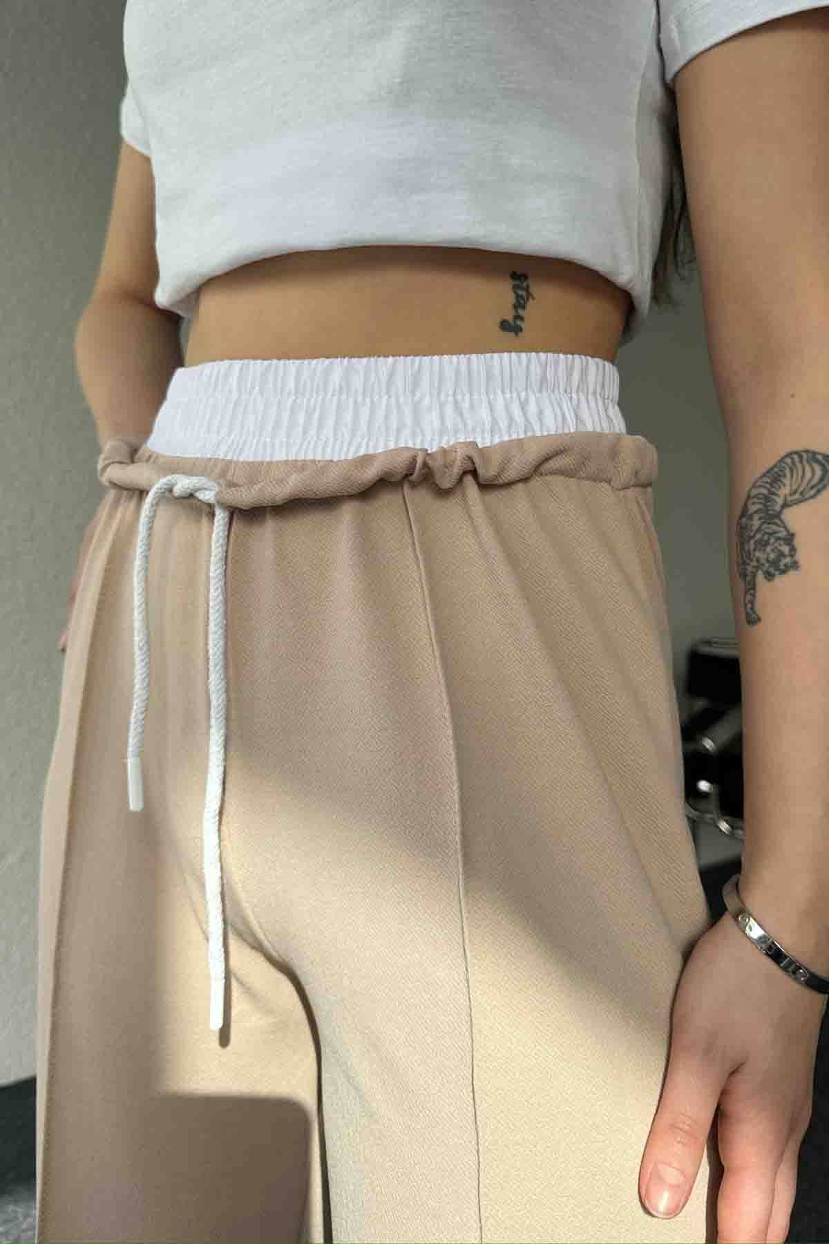 PNT-7382 Krem Çimalı Bel Lastikli Krep Kumaş Pantolon