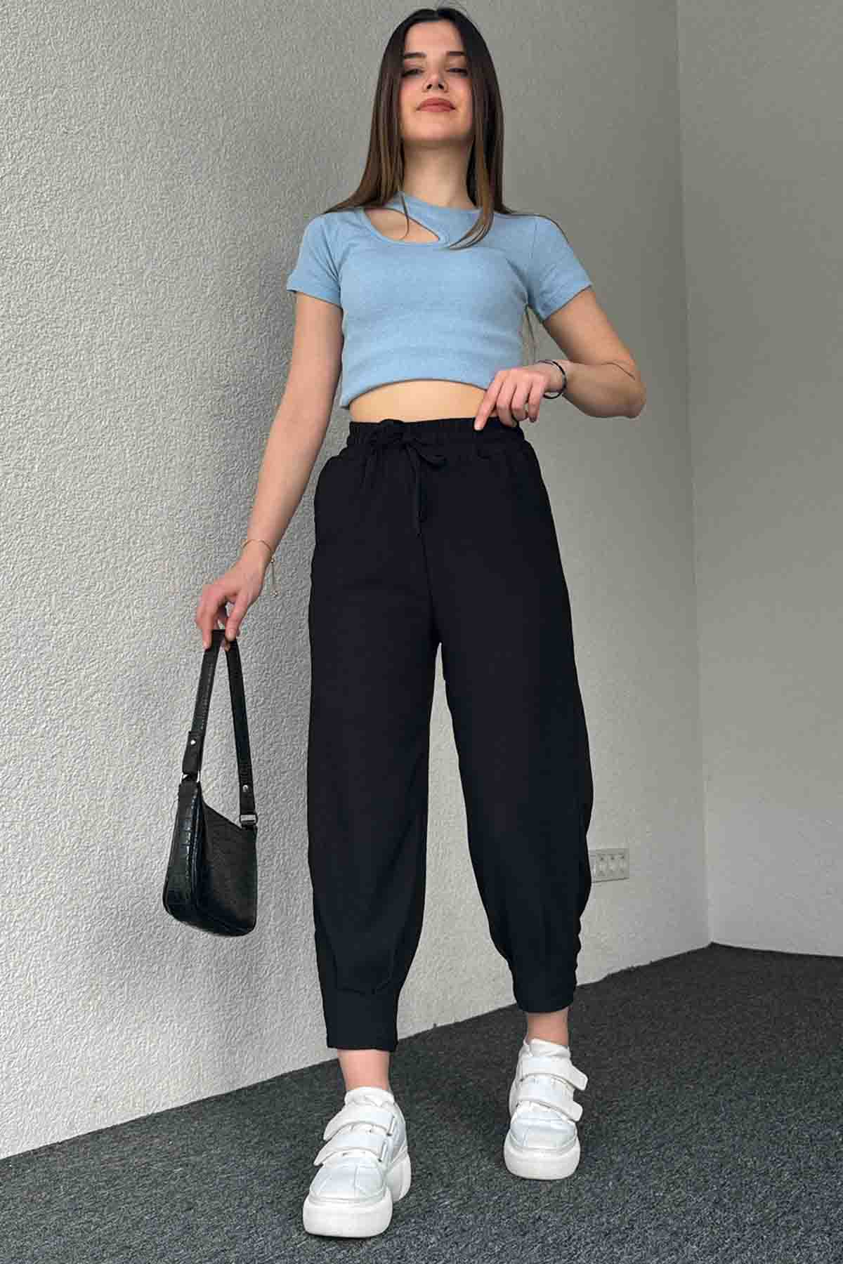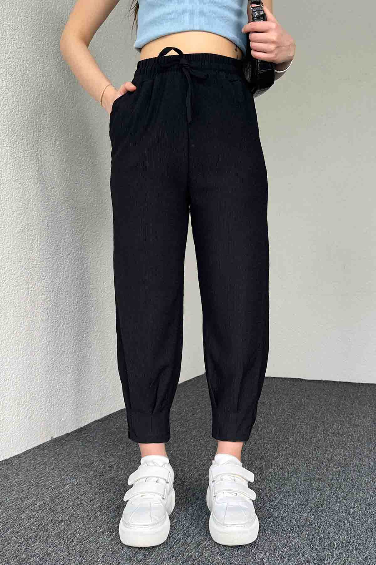 PNT-7384 Siyah Gofre Kumaş Pens Detaylı Şalvar Pantolon