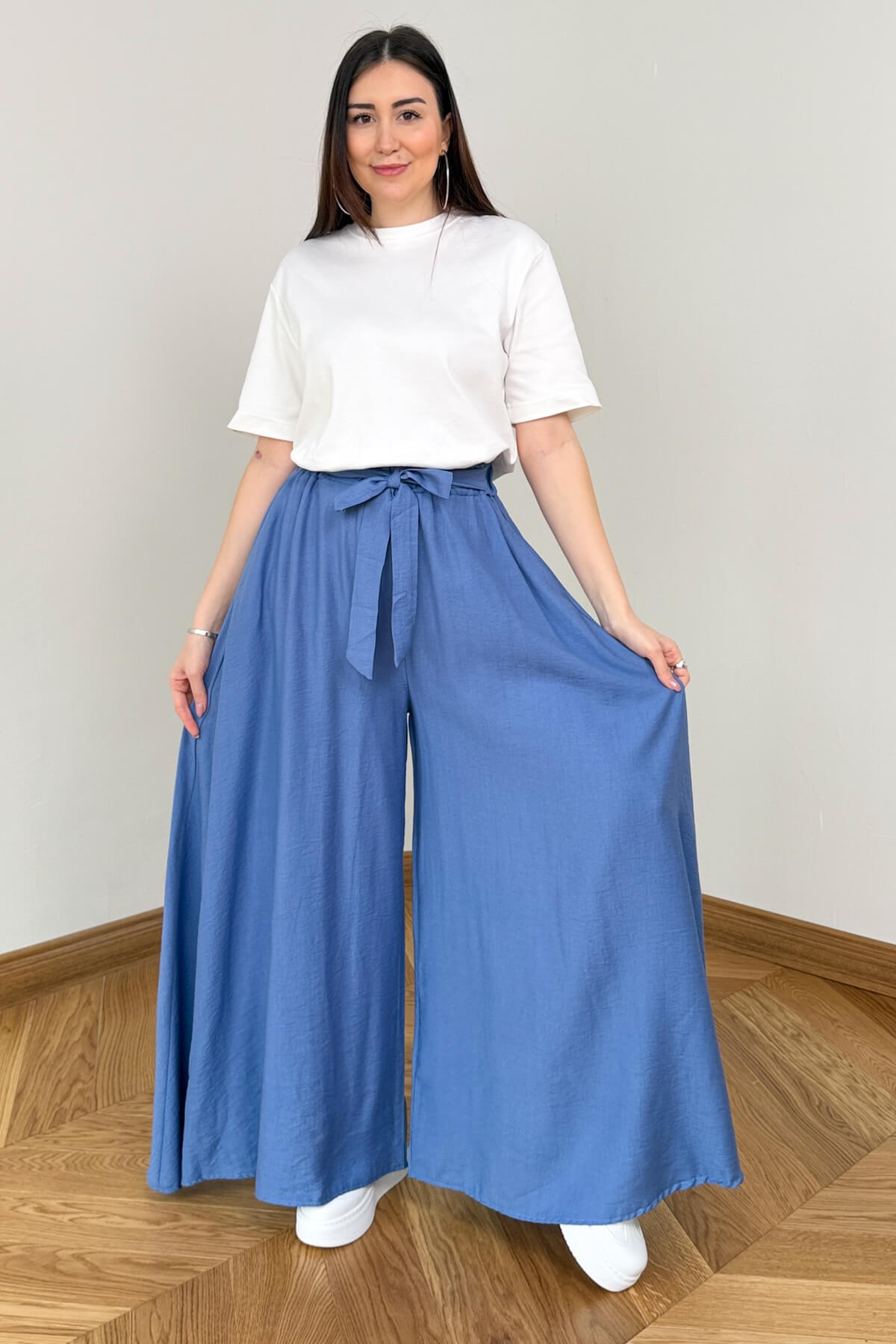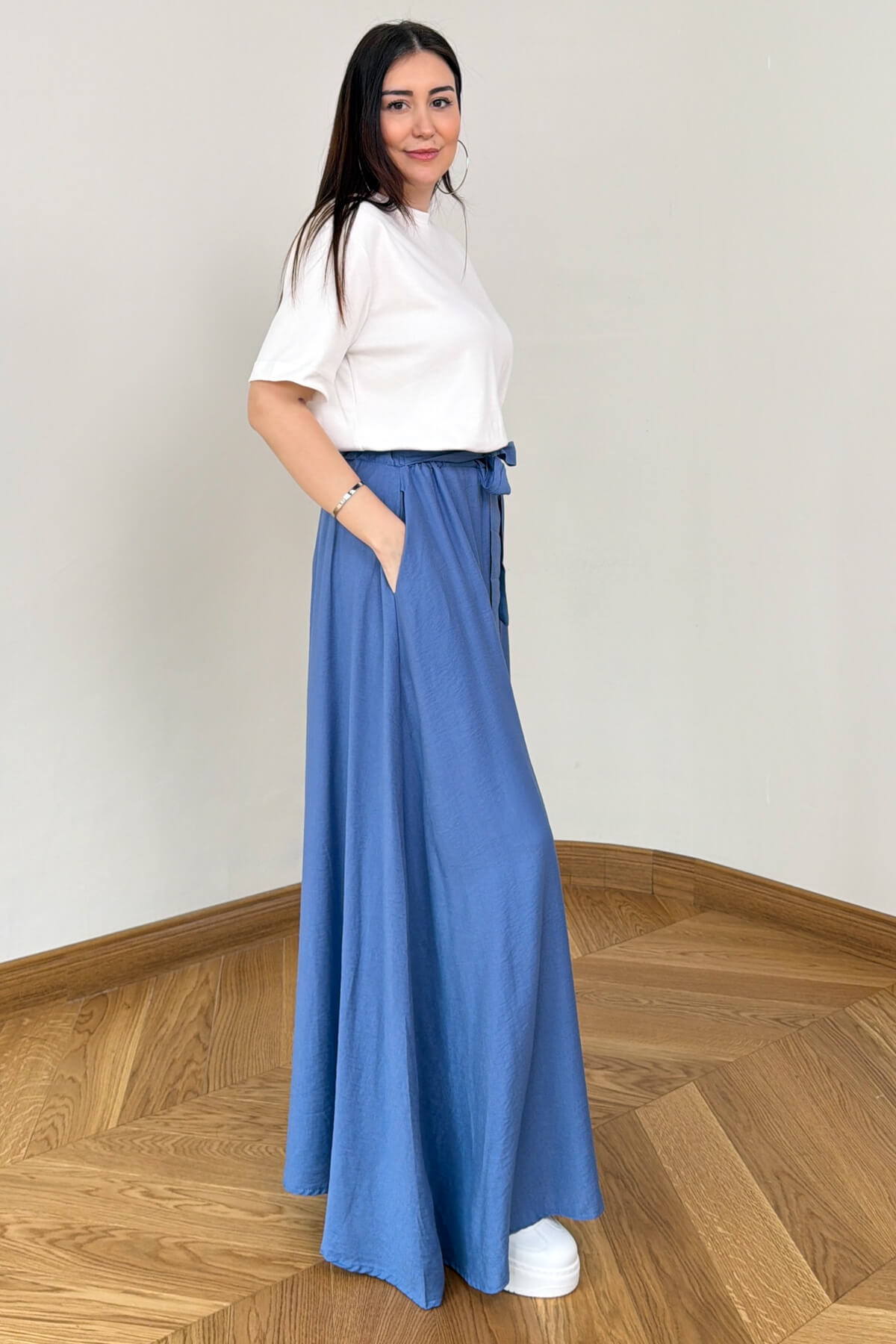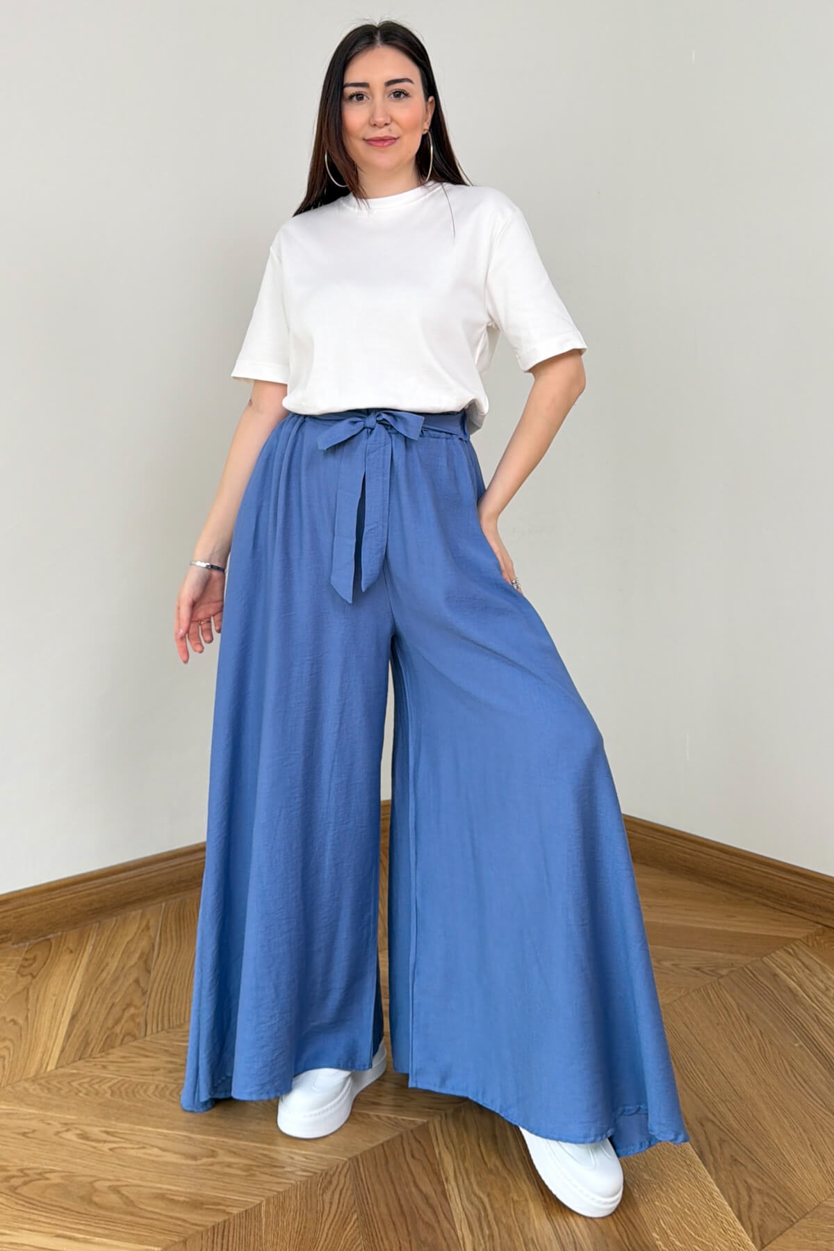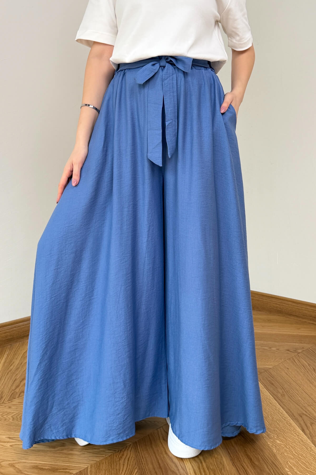 Geleneksel şalvar kesimini modern dokuma kumaşın asil duruşuyla yeniden yorumlayan bu pantolon, konfor ve zarafeti bir arada sunuyor. Bel kısmındaki feminen bağlama detayı ile silüetinizi zarifçe vurgularken, dökümlü yapısı ve fonksiyonel yan cepleriyle günlük kullanımda eşsiz bir rahatlık sağlıyor. Dokuma kumaşın tok ve kaliteli dokusu, her adımda akışkan bir görünüm sergileyerek gardırobunuzun en joker parçalarından biri olmaya aday.