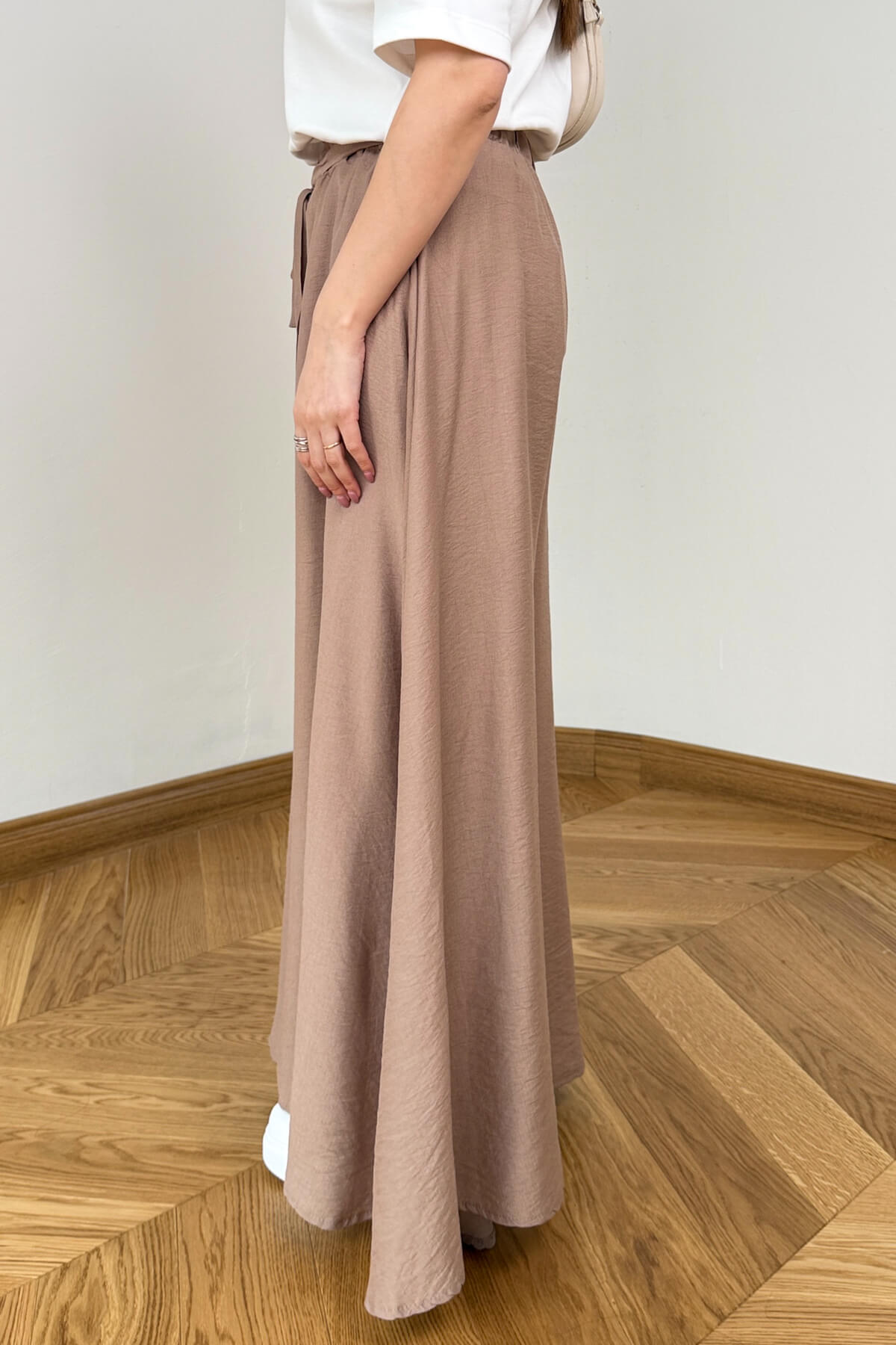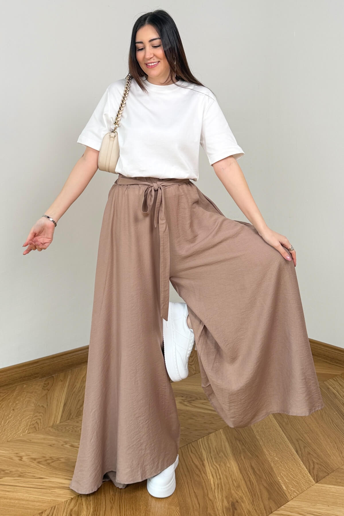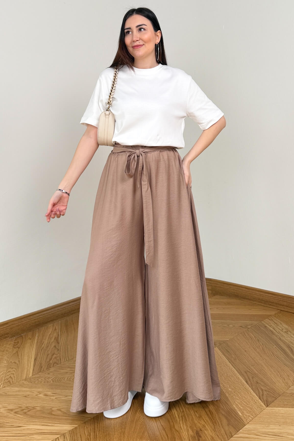 Geleneksel şalvar kesimini modern dokuma kumaşın asil duruşuyla yeniden yorumlayan bu pantolon, konfor ve zarafeti bir arada sunuyor. Bel kısmındaki feminen bağlama detayı ile silüetinizi zarifçe vurgularken, dökümlü yapısı ve fonksiyonel yan cepleriyle günlük kullanımda eşsiz bir rahatlık sağlıyor. Dokuma kumaşın tok ve kaliteli dokusu, her adımda akışkan bir görünüm sergileyerek gardırobunuzun en joker parçalarından biri olmaya aday.