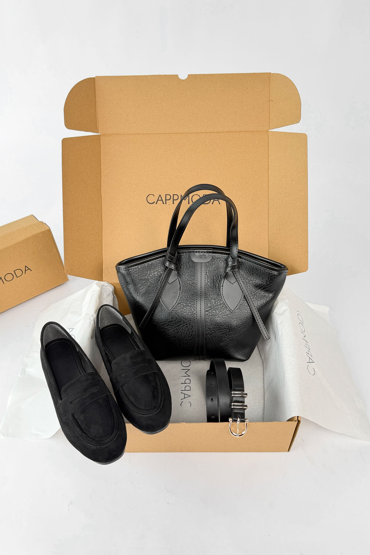 Tasarım Detayı: Çantada estetik biye işçiliği, kemerde çift metal köprü ve ayakkabıda maskülen bant detayı