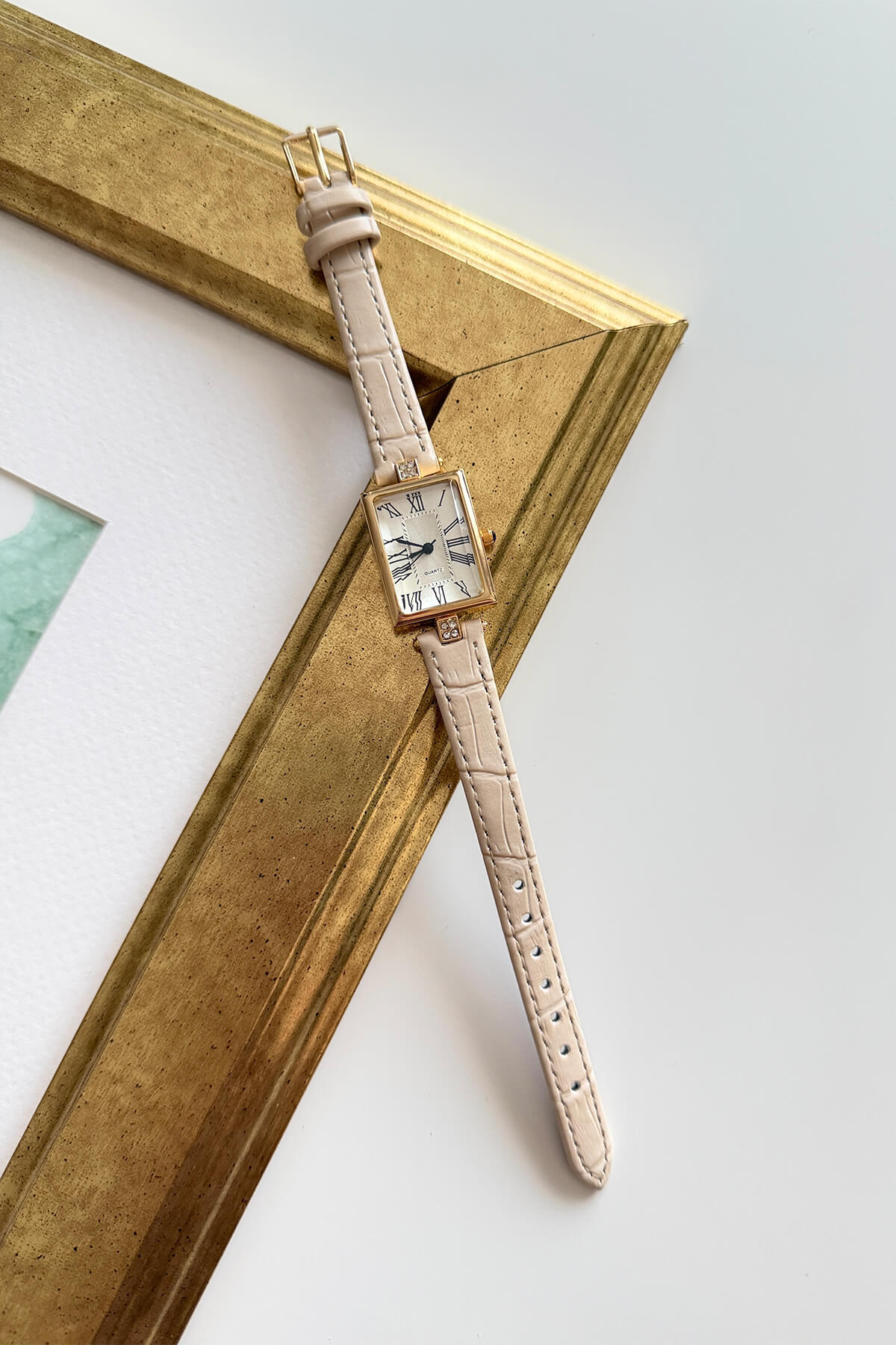Dikdörtgen kasanın keskin hatları, Roma rakamlı klasik kadranla buluşuyor. İnce krokodil desenli deri kayışı ve kasa birleşimindeki taş detaylarıyla bu model, stilinize sofistike bir dokunuş katmak için tasarlandı. Kahve ve bej seçenekleriyle, her kombine uyum sağlayan zamansız bir aksesuar.