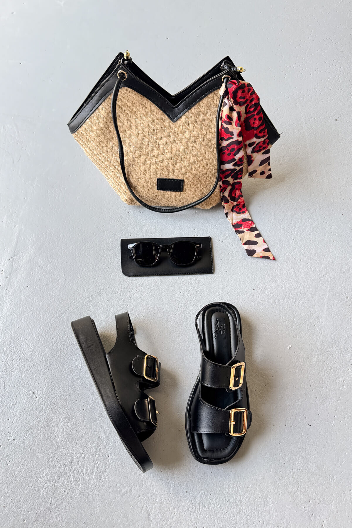 SET101 Siyah Sandalet - Çanta - Gözlük Yazlık 3'lü Set