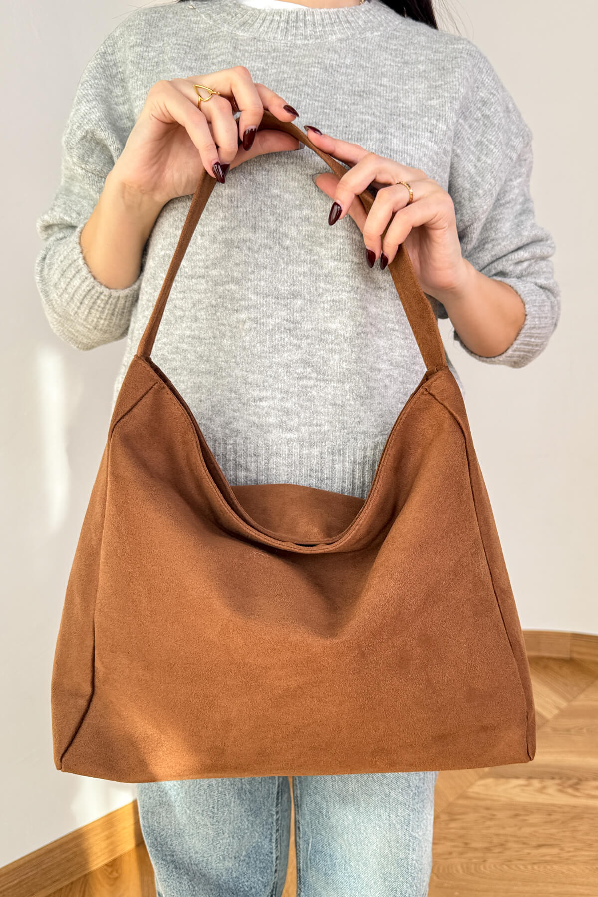 Süet dokulu çanta, astarlı iç yapısı ve iç cep detayıyla hem zarif hem fonksiyonel bir görünüm kazandırır.