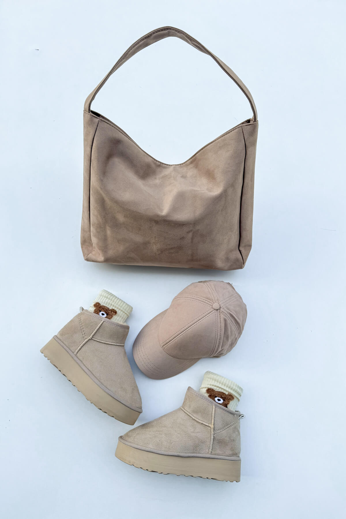 Süet dokulu çanta, astarlı iç yapısı ve iç cep detayıyla hem zarif hem fonksiyonel bir görünüm kazandırır.