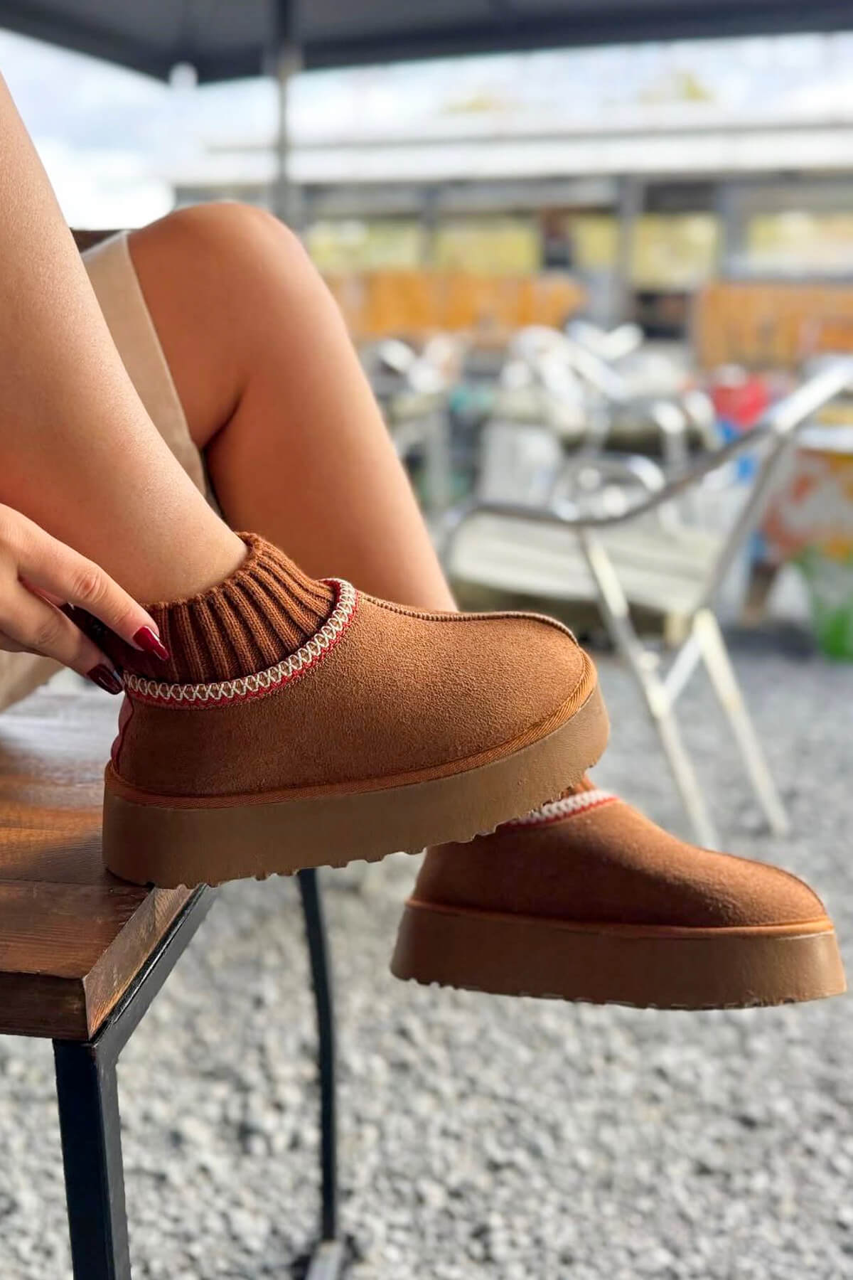 Örgü bilek detaylı model, ayağı saran cozy formuyla modern bir görünüm kazandırır.
