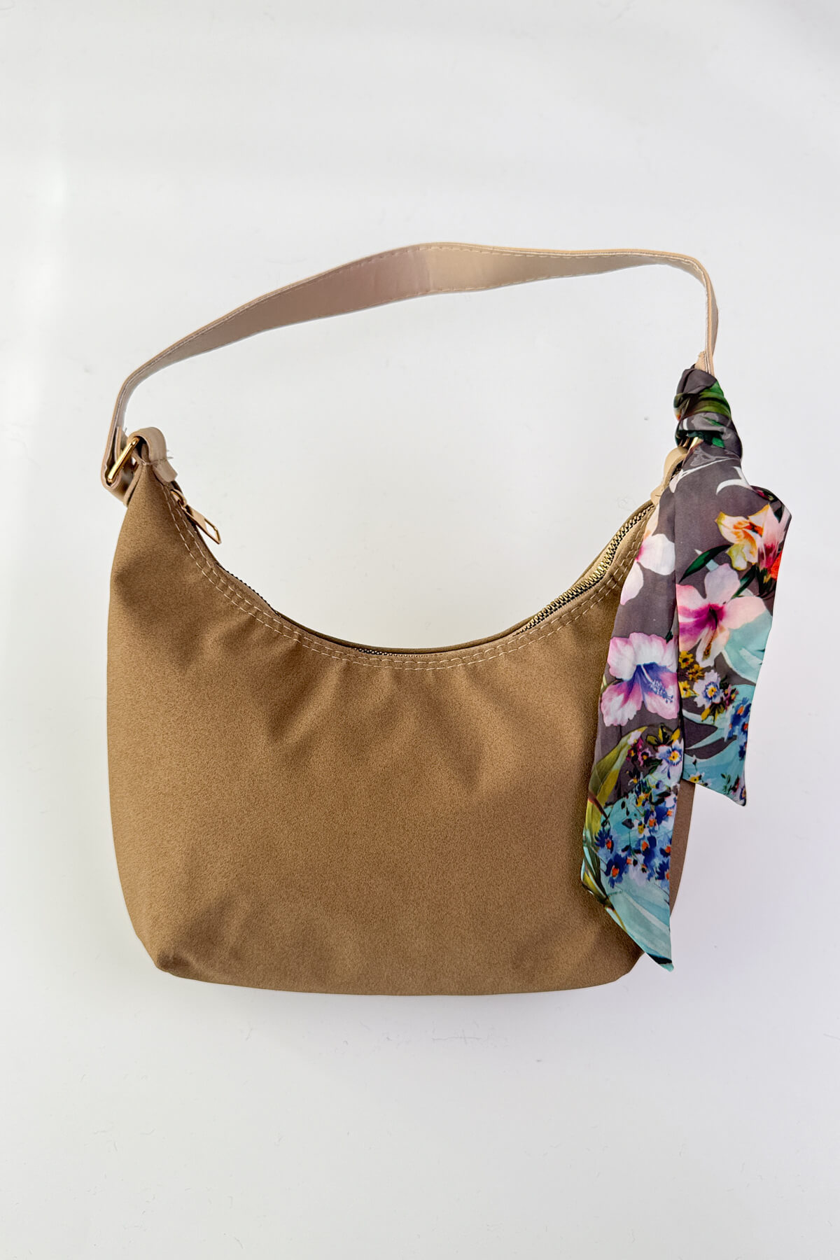 Süet omuz çantası, desenli fular detayı ve fermuarlı yapısıyla zarif bir dokunuş sunar.