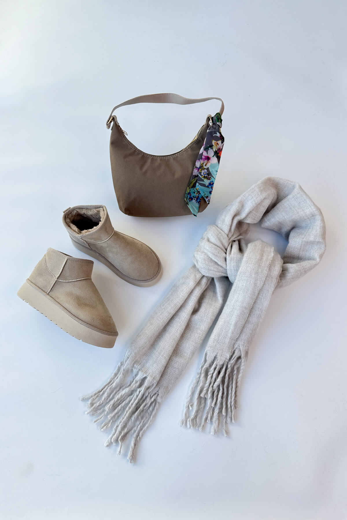 Bu sıcak tonlu üçlü set; süet omuz çantası, tam kürklü bilek boy bot ve püskül detaylı yumuşak şal ile kış stilini kusursuz tamamlar.