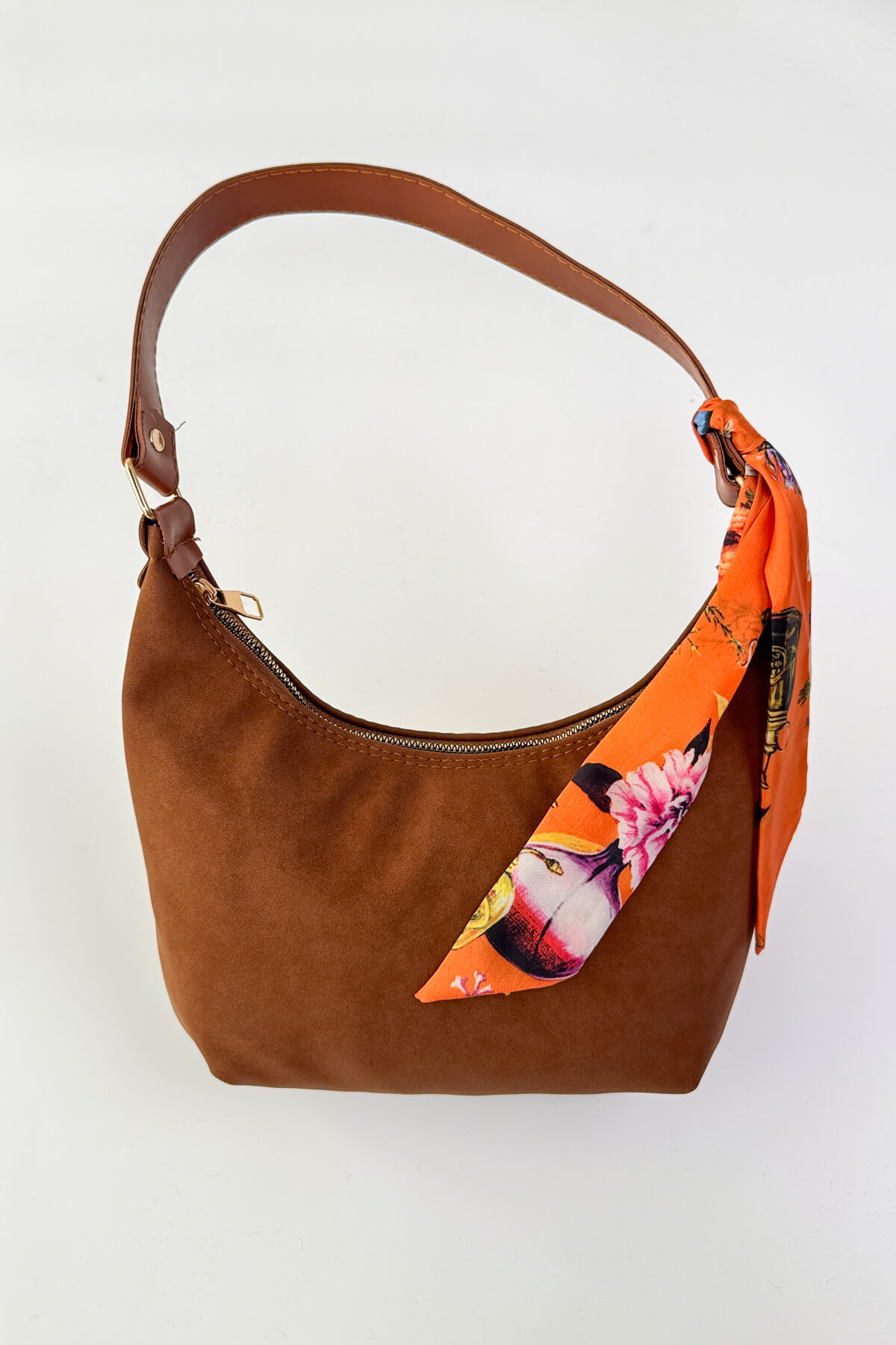 Süet omuz çantası, fular detayı ve fermuarlı yapısıyla şık bir dokunuş sağlar.