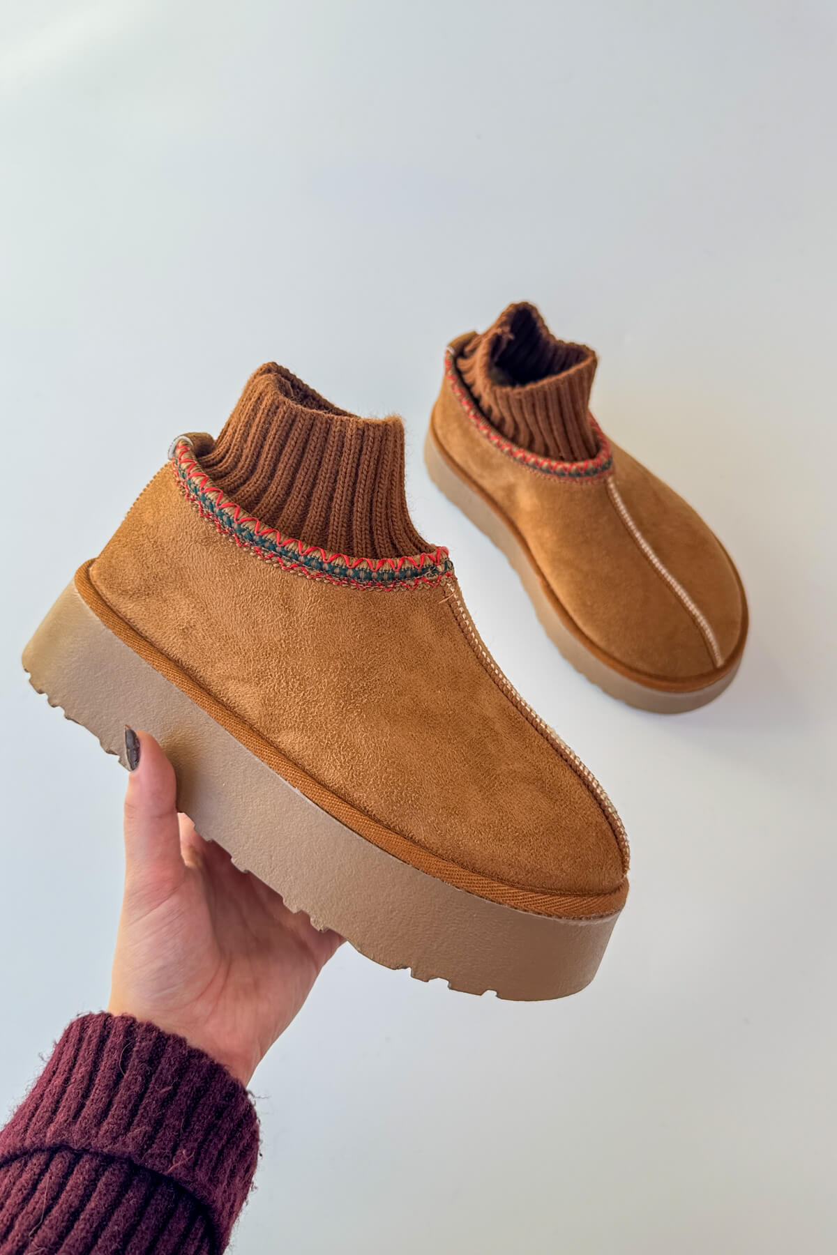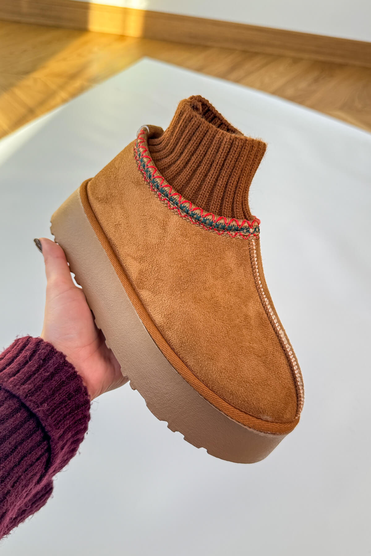 Örgü bilek detayı, ayağı saran cozy bir duruş kazandırır.