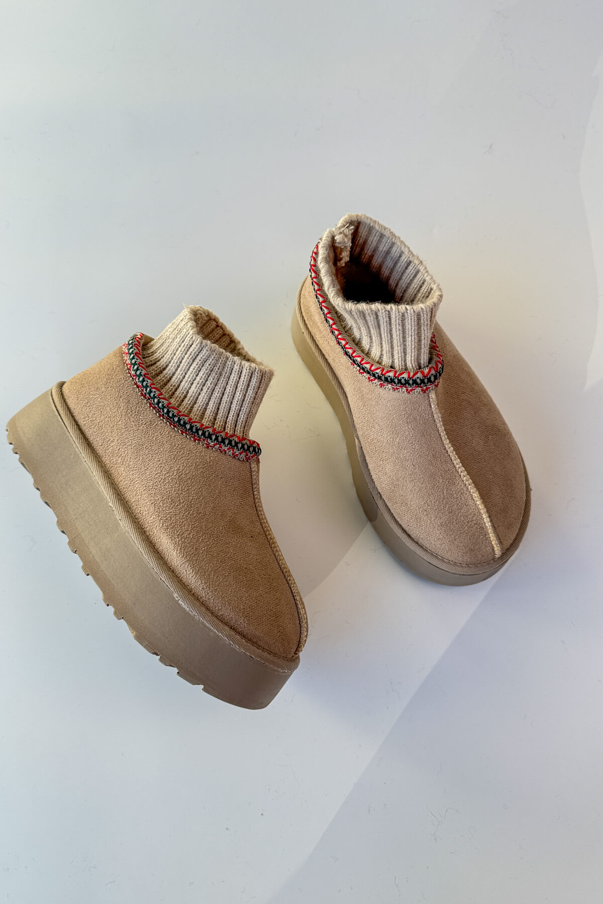 Örgü bilek detayı, ayağı saran cozy bir duruş kazandırır.
