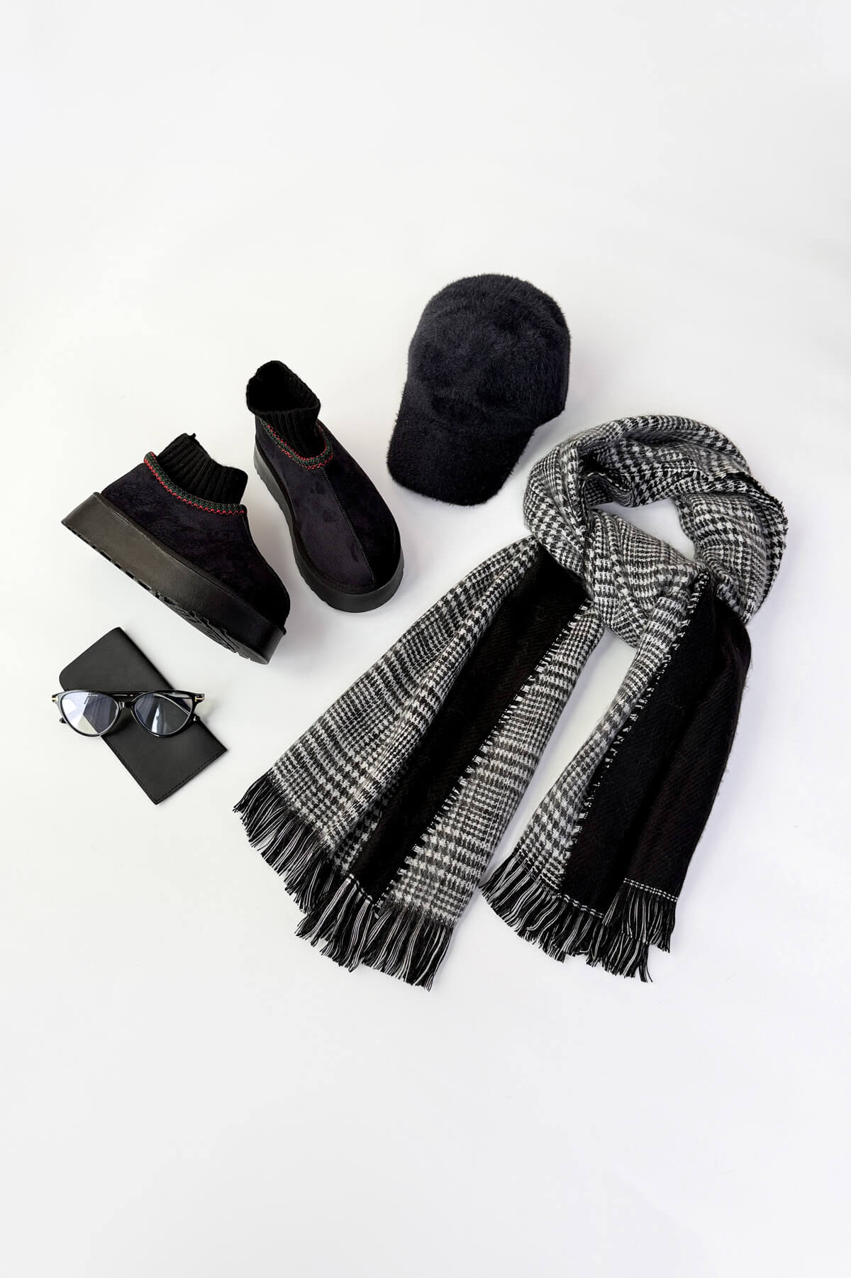 Kış stilinizde fark yaratacak bu özel set; konforu ve "cool" duruşu bir araya getiriyor. Setin yıldızı olan tam kürklü ve örgü bilek detaylı botlar soğuktan korurken, kombini tamamlayan güneş gözlüğü stilinize modern bir imza atıyor. Kazayağı desenli atkı ve yumuşak dokulu şapka ile hem sıcak hem de trend bir görünüm yakalayın.