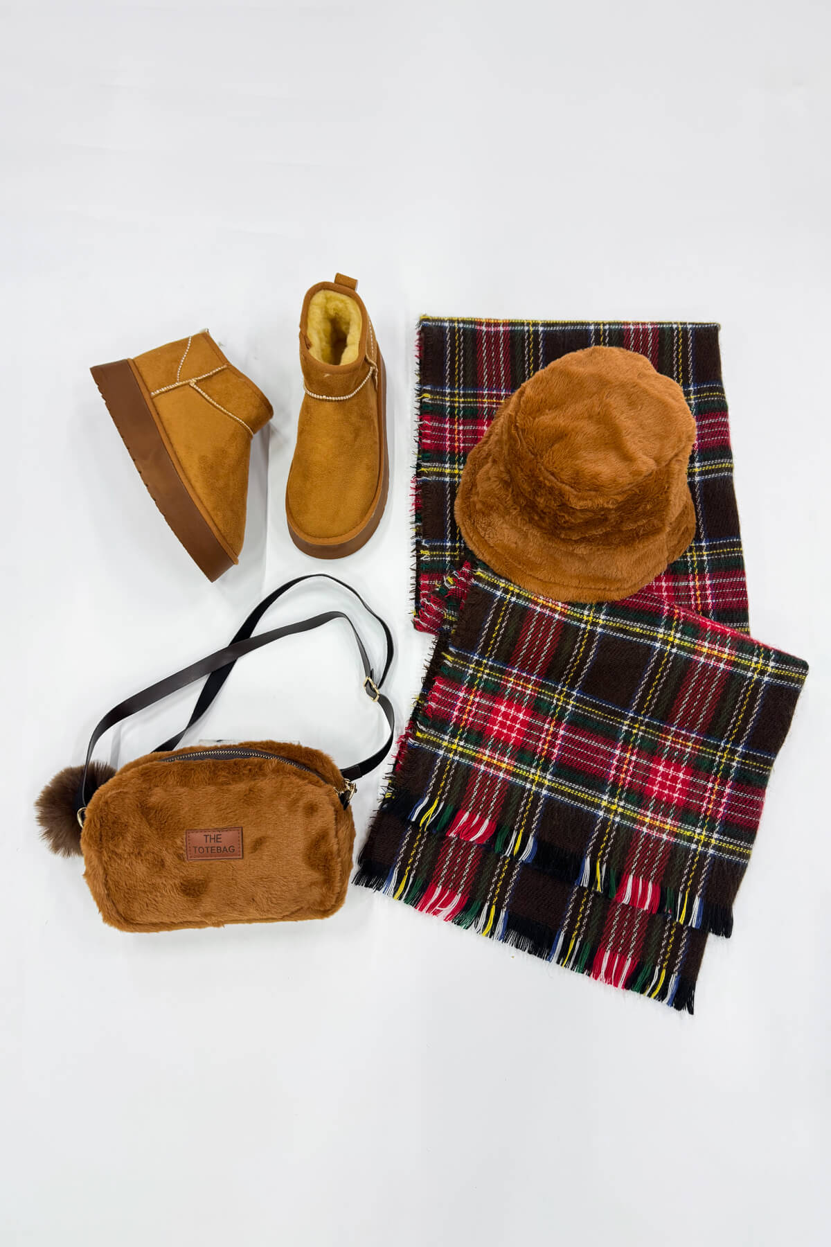 Kış stilinizi tek bir dokunuşla tamamlamanız için özenle hazırlanan bu 4 parçalı özel set, soğuk havalarda hem sıcaklığı hem de şıklığı garanti ediyor. Setin yıldızı olan canlı ekose şal, siyahın asaletini taşıyan peluş çanta ve bucket şapka ile kusursuz bir uyum yakalıyor. 4 cm taban yüksekliğine sahip konforlu botlar ise bu "cozy" (sıcacık) görünümü tamamlayarak gün boyu rahat adımlar atmanızı sağlıyor. Birbiriyle mükemmel eşleşen dokular ve renklerle, zahmetsiz şıklığın keyfini çıkarın.