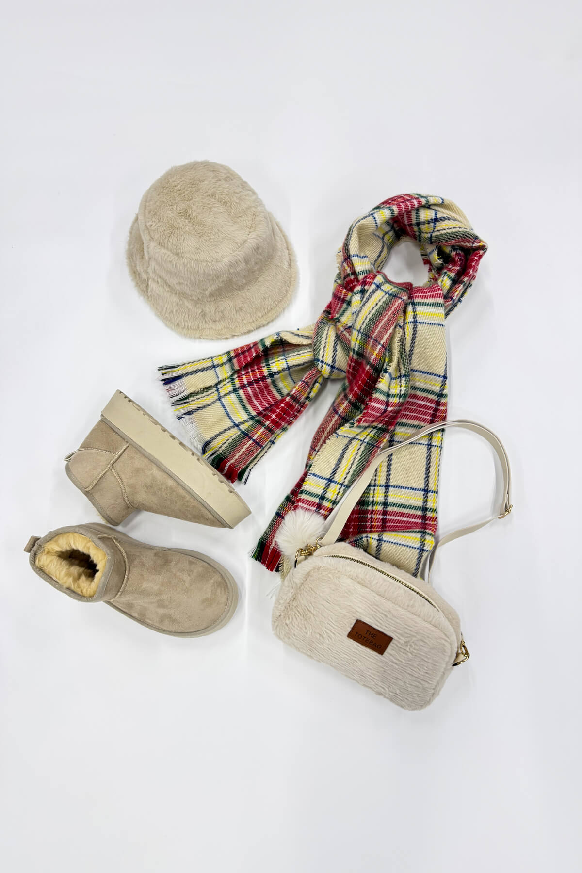 Kış stilinizi tek bir dokunuşla tamamlamanız için özenle hazırlanan bu 4 parçalı özel set, soğuk havalarda hem sıcaklığı hem de şıklığı garanti ediyor. Setin yıldızı olan canlı ekose şal, siyahın asaletini taşıyan peluş çanta ve bucket şapka ile kusursuz bir uyum yakalıyor. 4 cm taban yüksekliğine sahip konforlu botlar ise bu "cozy" (sıcacık) görünümü tamamlayarak gün boyu rahat adımlar atmanızı sağlıyor. Birbiriyle mükemmel eşleşen dokular ve renklerle, zahmetsiz şıklığın keyfini çıkarın.