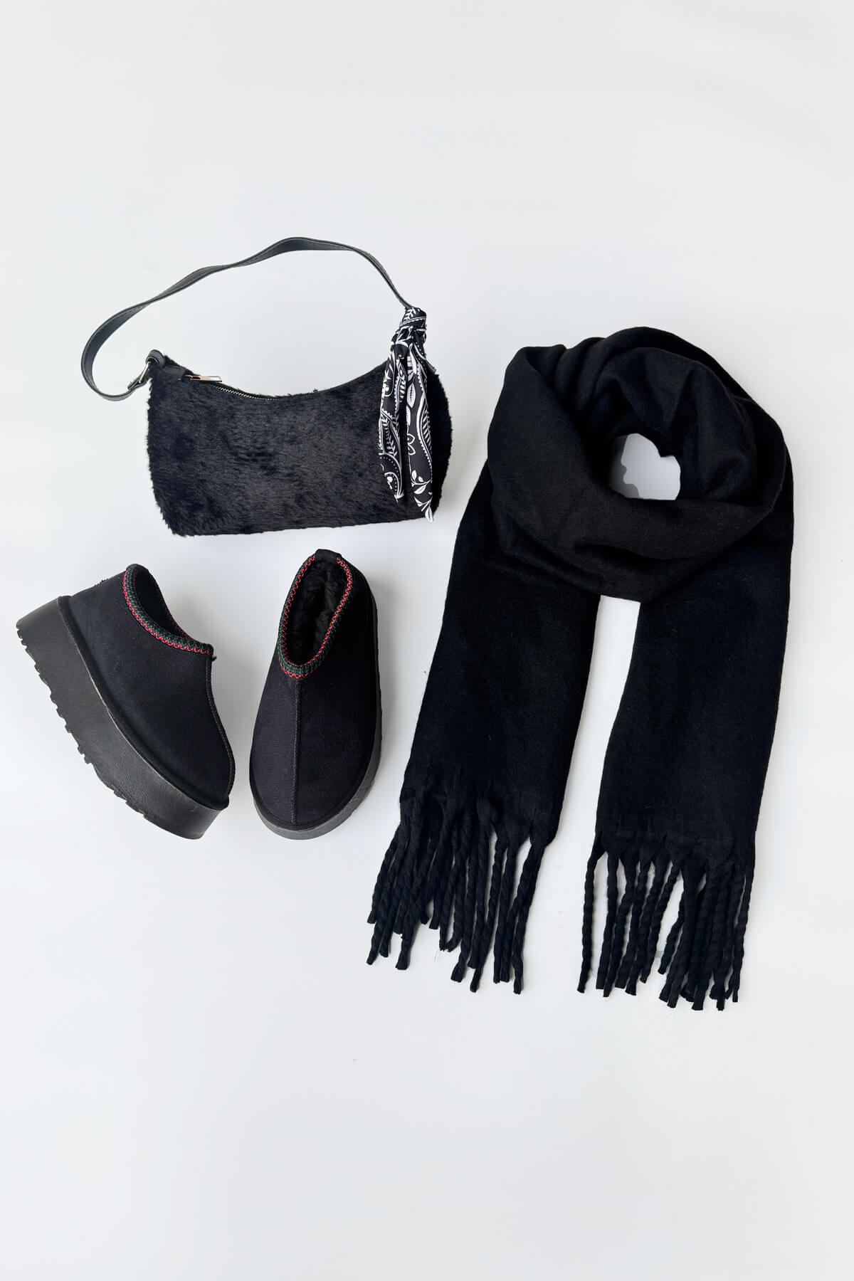 Kumaş Türü: Botlar süet görünümlü ve içi kürklü, çanta yumuşak peluş, şal ise yumuşak dokulu triko.