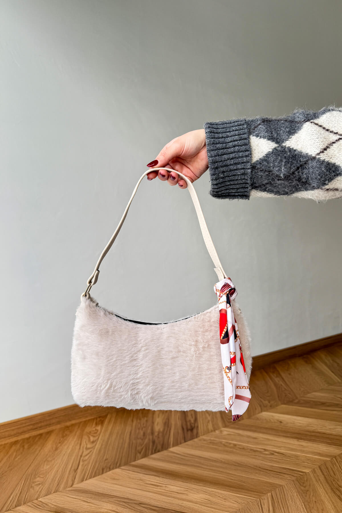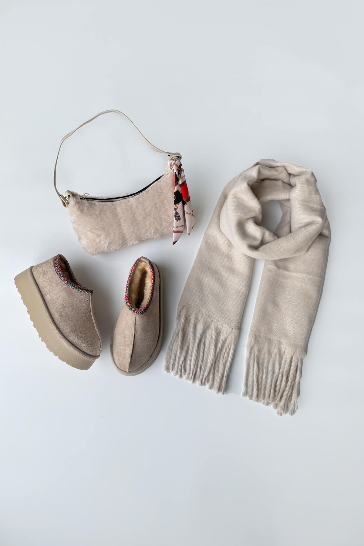 Kumaş Türü: Botlar süet görünümlü ve içi kürklü, çanta yumuşak peluş, şal ise yumuşak dokulu triko.