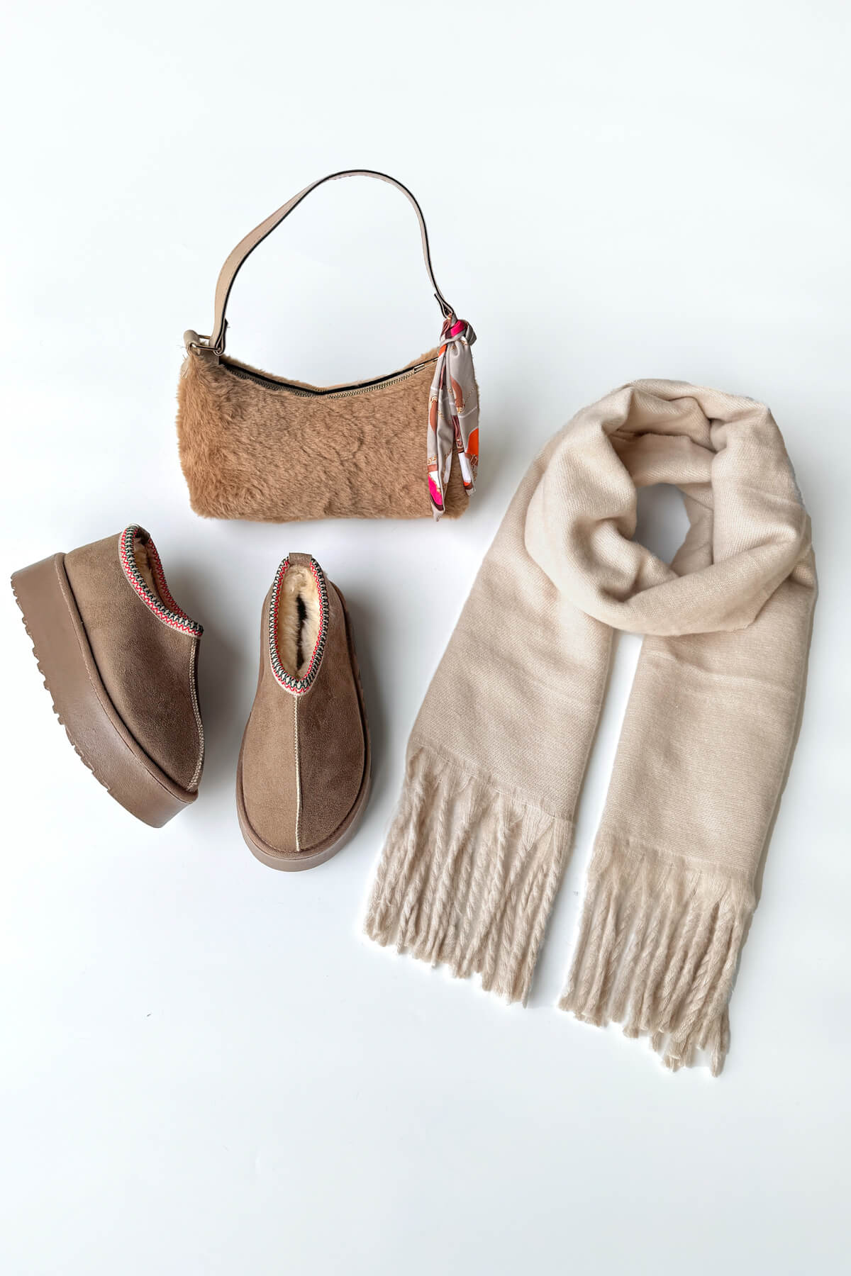 Kumaş Türü: Botlar süet görünümlü ve içi kürklü, çanta yumuşak peluş, şal ise yumuşak dokulu triko.