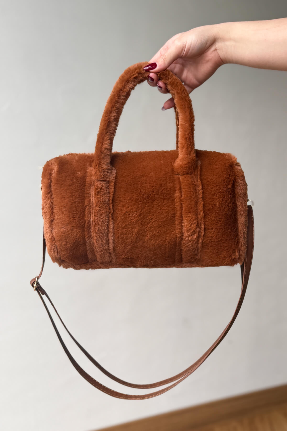 Kumaş Türü: Botlar süet görünümlü ve içi yoğun kürk kaplamalıdır; çanta ve şapka yumuşak peluş dokuludur.