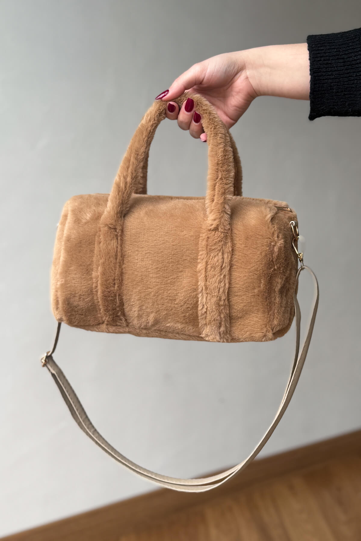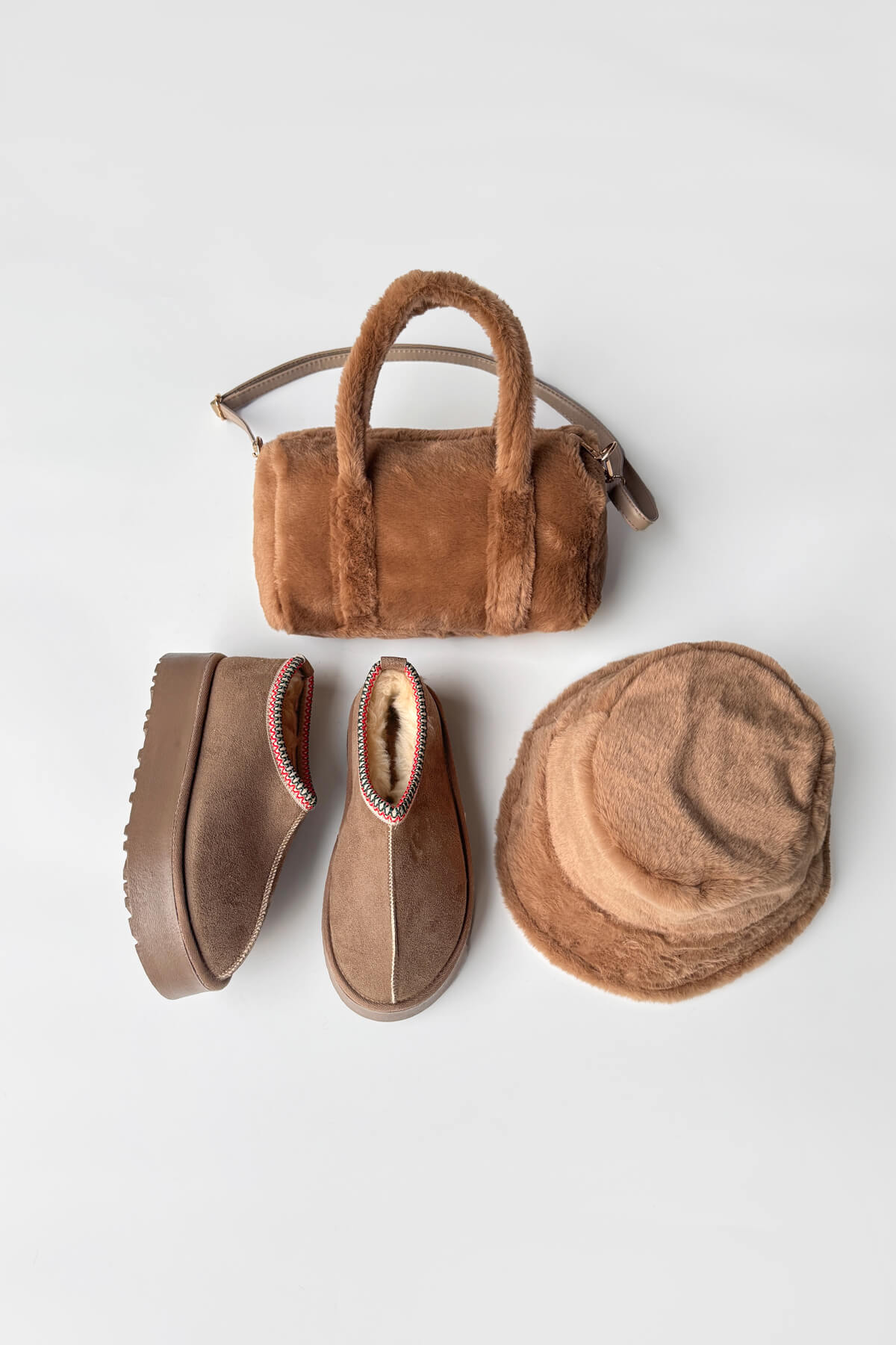 Kumaş Türü: Botlar süet görünümlü ve içi yoğun kürk kaplamalıdır; çanta ve şapka yumuşak peluş dokuludur.