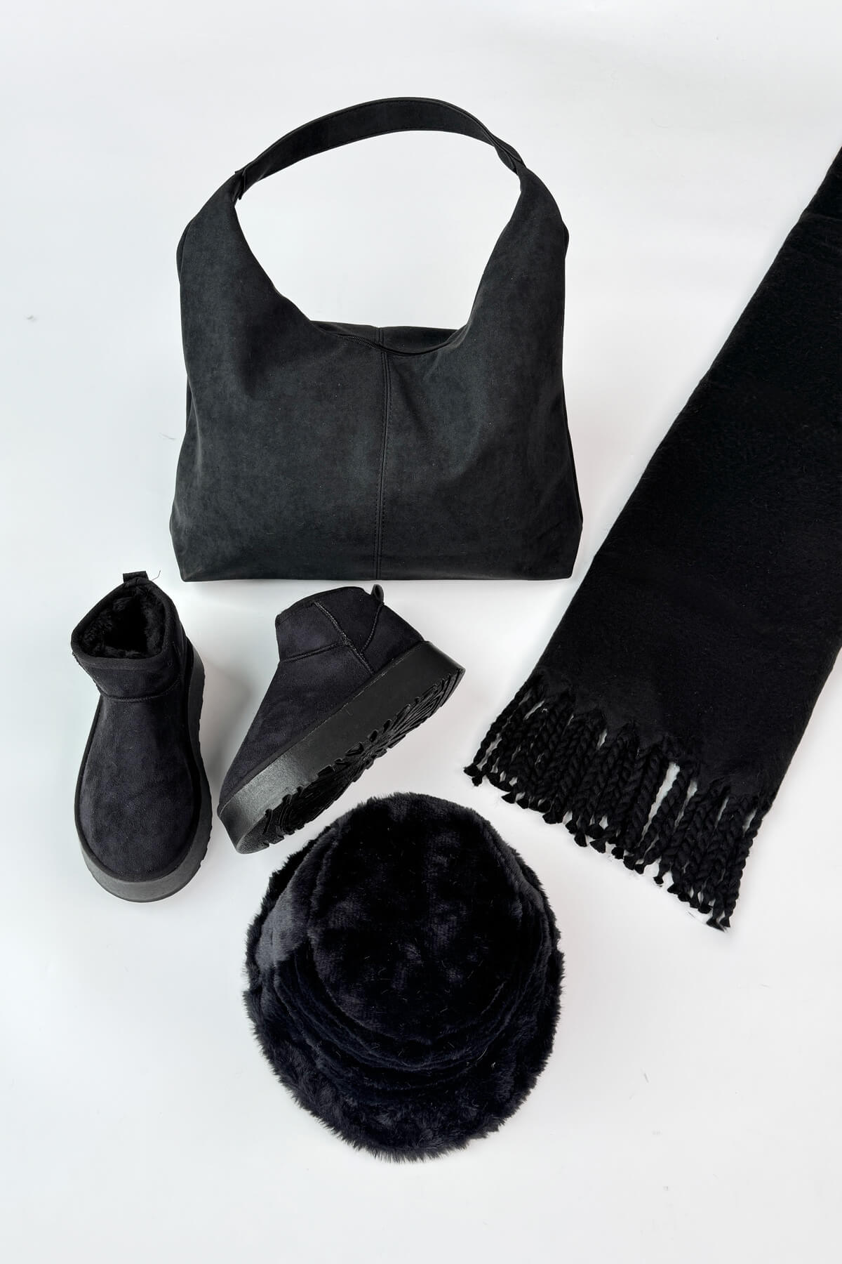 Kış gardırobunuzun anahtar parçalarını tek bir pakette sunan bu dörtlü set, soğuk havalarda stil sahibi bir görünüm yakalamanız için özenle tasarlandı. Süet görünümlü geniş omuz çantası ve püskül detaylı yumuşak şal, günlük kombinlerinize zarif bir dokunuş katarken; sezonun trendi peluş bucket şapka modern bir silüet yaratır. 4 cm taban yüksekliğine sahip, içi kürklü botlar ise ayaklarınızı sıcak tutarken konforlu adımlar atmanızı sağlar. Doku uyumuyla göz kamaştıran bu set, "ne giyeceğim" derdini ortadan kaldıran kurtarıcı bir kapsül koleksiyondur.