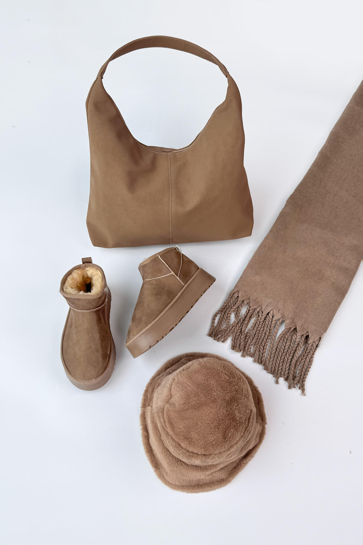Kış gardırobunuzun anahtar parçalarını tek bir pakette sunan bu dörtlü set, soğuk havalarda stil sahibi bir görünüm yakalamanız için özenle tasarlandı. Süet görünümlü geniş omuz çantası ve püskül detaylı yumuşak şal, günlük kombinlerinize zarif bir dokunuş katarken; sezonun trendi peluş bucket şapka modern bir silüet yaratır. 4 cm taban yüksekliğine sahip, içi kürklü botlar ise ayaklarınızı sıcak tutarken konforlu adımlar atmanızı sağlar. Doku uyumuyla göz kamaştıran bu set, "ne giyeceğim" derdini ortadan kaldıran kurtarıcı bir kapsül koleksiyondur.