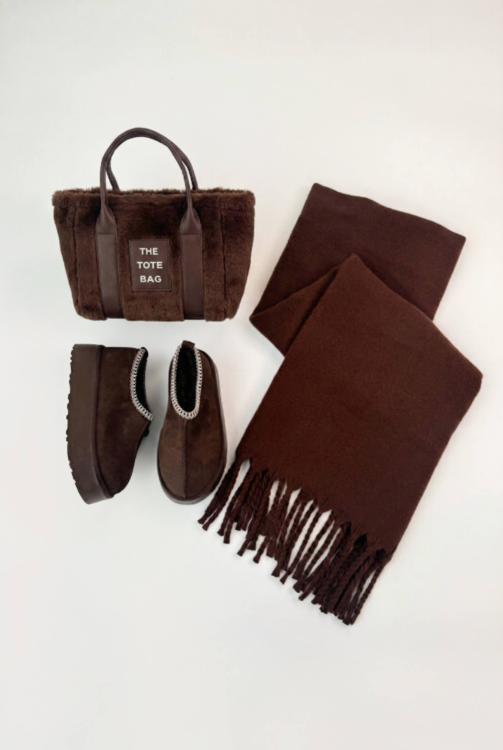 Kumaş ve Doku: Bot ve çanta yumuşak peluş/süet dokulu; şal ise yumuşak triko dokuludur.