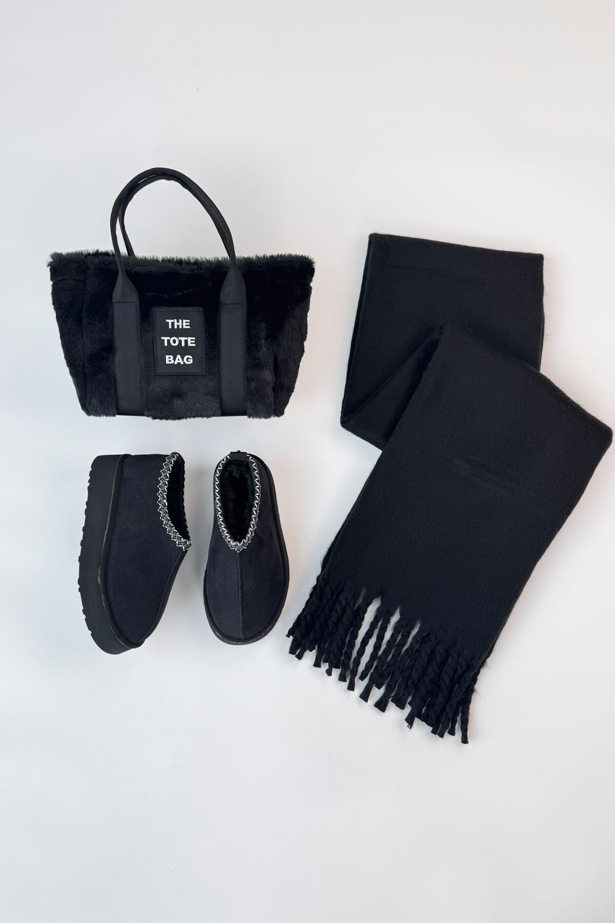 Kumaş ve Doku: Bot ve çanta yumuşak peluş/süet dokulu; şal ise yumuşak triko dokuludur.