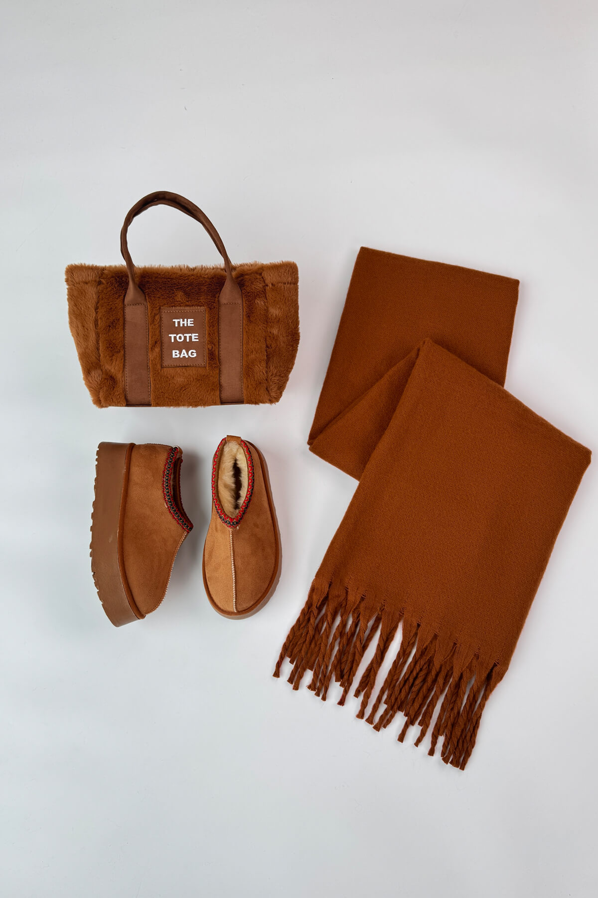 Kumaş ve Doku: Bot ve çanta yumuşak peluş/süet dokulu; şal ise yumuşak triko dokuludur.
