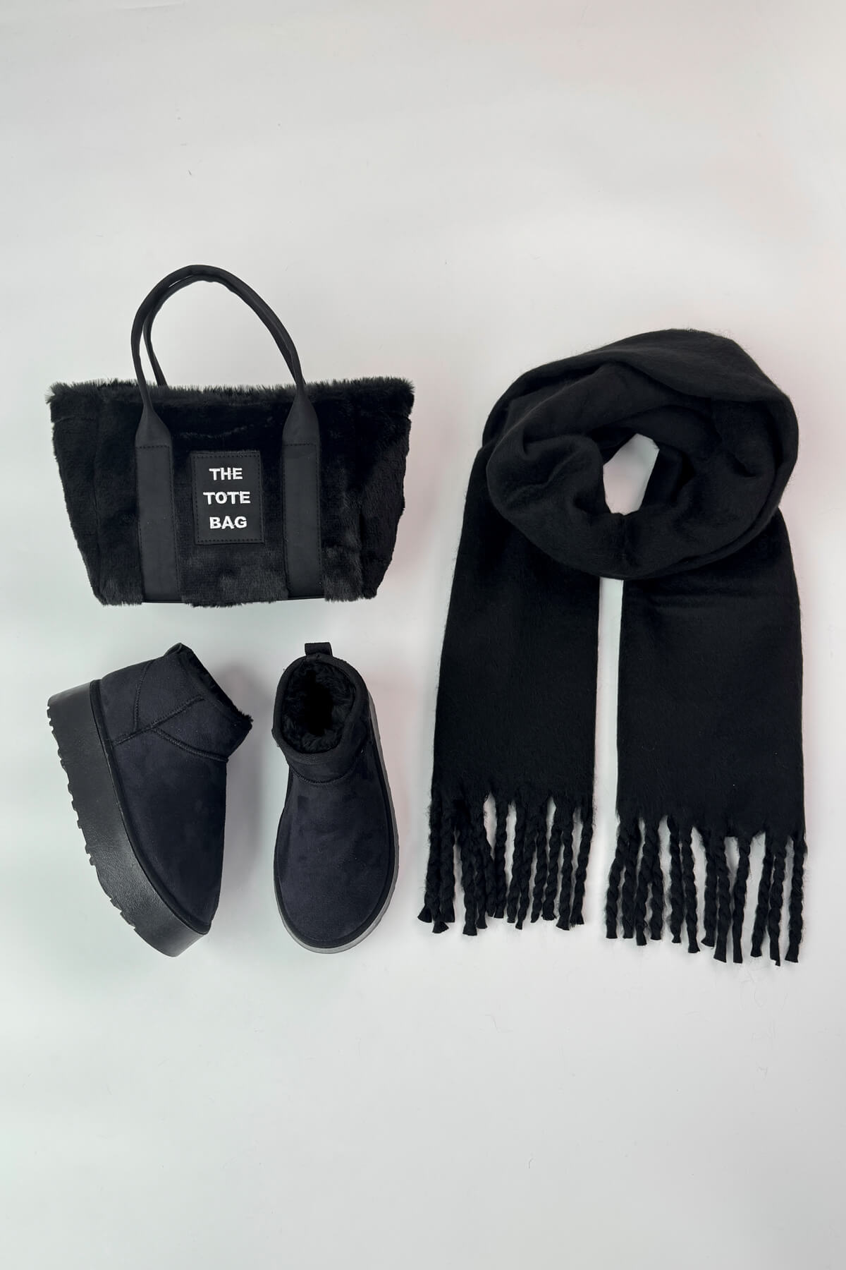 Soğuk havalarda stilinizden ödün vermeden maksimum koruma sağlayan bu özel üçlü set, kış gardırobunuzun en işlevsel parçalarını bir araya getiriyor. Baştan sona tam kürklü iç astarıyla ayağınızı sıcak tutan botlar, yumuşacık dış dokusuyla hem modern hem de otantik bir duruş sergiler. Kombinin en dikkat çekici parçası olan peluş dokulu çanta, farklı materyalden tasarlanan sap detayları ve kullanışlı yapısıyla şehir stiline uyum sağlar. Görünümü tamamlayan sade tasarımlı püsküllü şal ise yumuşak dokusuyla sizi sararak soğuk günlerde ekstra konfor sunar.