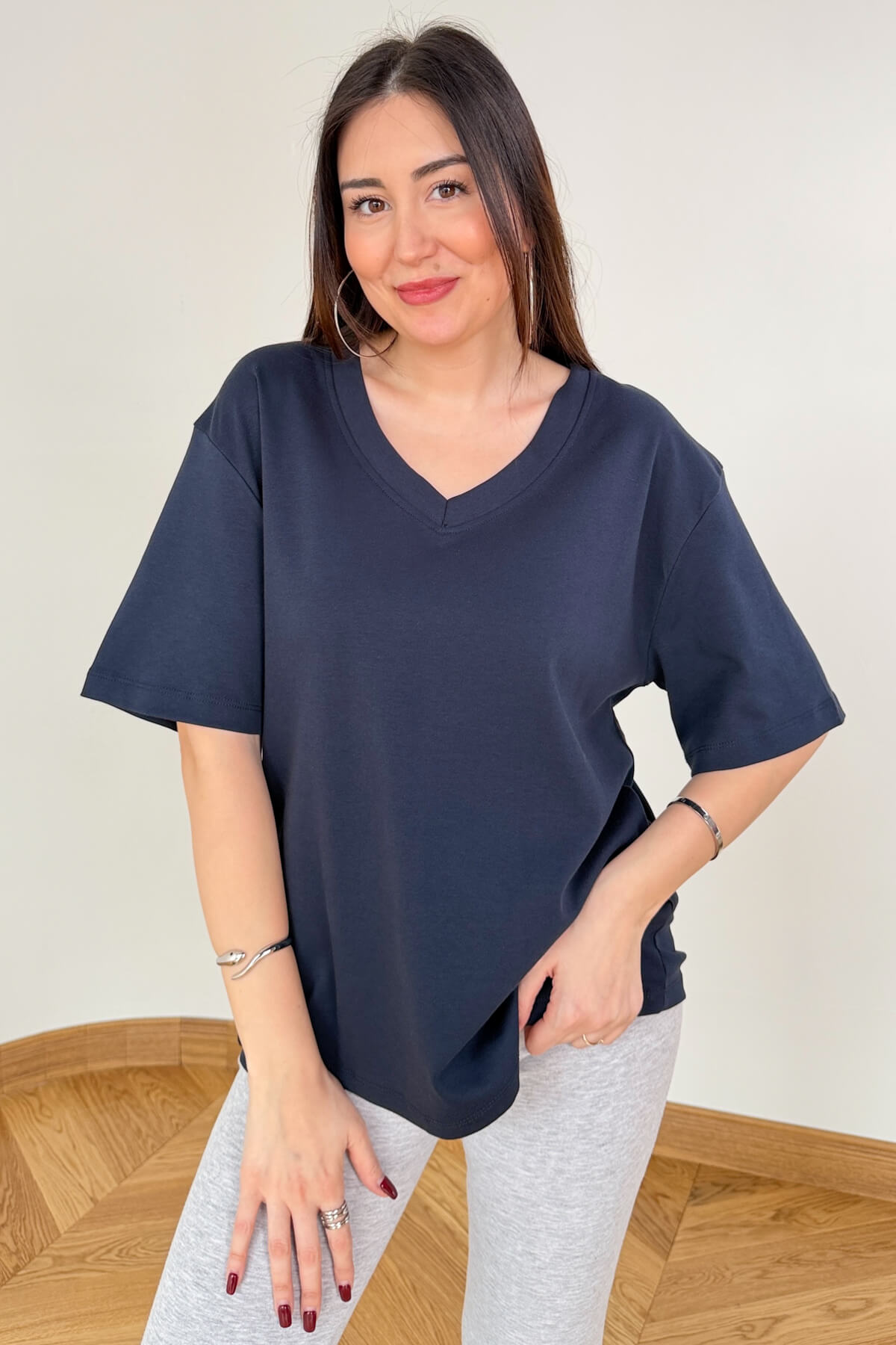 Kombin Önerisi: V yakanın açtığı dekolteyi ince zincir kolyelerle tamamlayabilir; blazer ceket ve kumaş pantolonlarla ofise, jeanlerle sokağa uyarlayabilirsiniz.