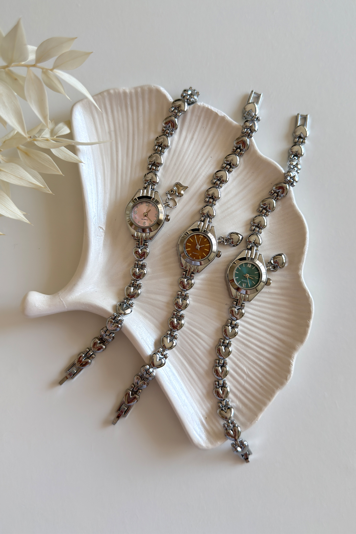 Shine, 20mm'lik minimal kasası ve birbirine geçmiş kalp motiflerinden oluşan özel kordon tasarımıyla romantizmi bileğinize taşıyor. Zümrüt yeşili kadranın derinliği, gümüş rengin parlaklığıyla birleşerek bu mini saatte büyüleyici bir kontrast yaratıyor. Hem şık bir bileklik hem de zarif bir saat olarak kullanabileceğiniz bu model, ince bilekler için kusursuz bir tercih.