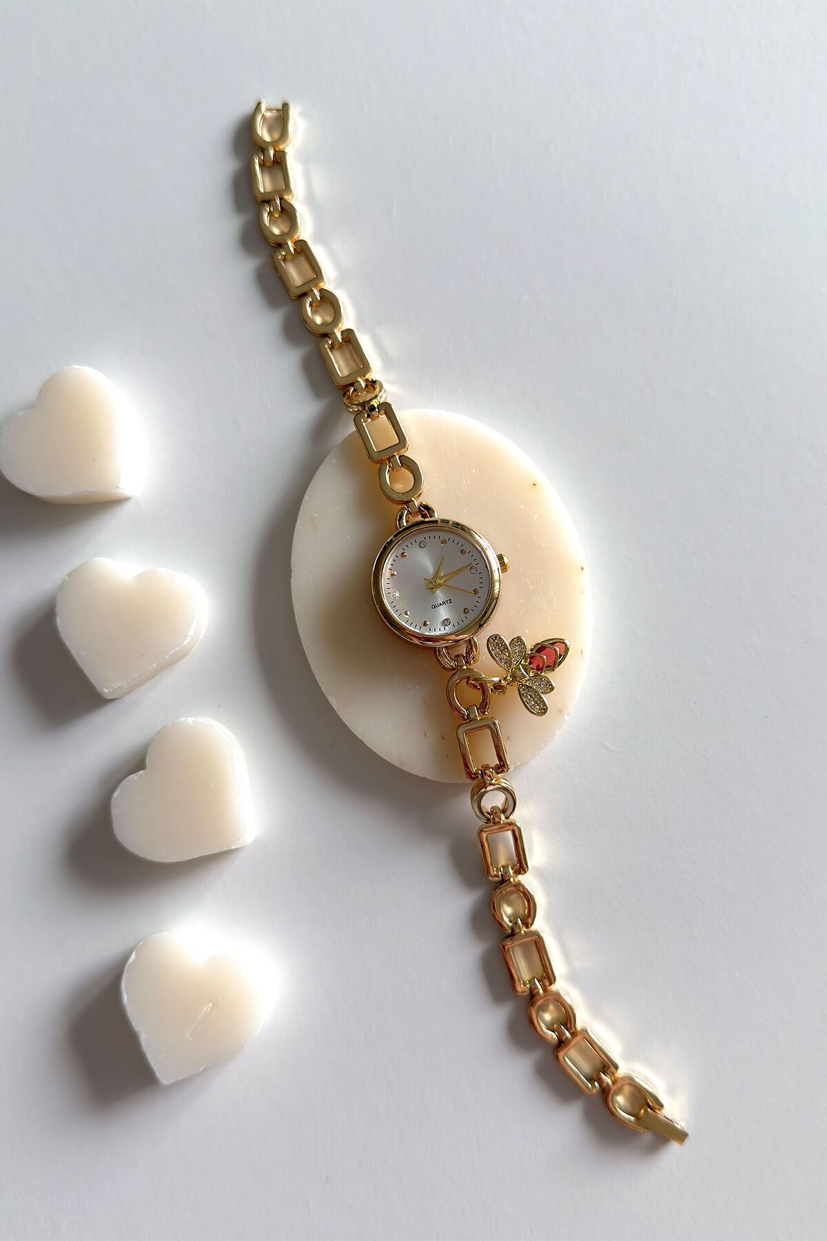 Zarafeti ve doğanın enerjisini bileğinizde taşıyın! Bu özel tasarım saat, klasik bir aksesuardan çok daha fazlasını sunuyor. Şık altın rengi metal kordonu, geometrik zincir bağlantılarıyla modern bir bileklik görünümü kazanırken; kadranın yanına iliştirilmiş taşlı arı figürü tasarıma dinamik ve neşeli bir dokunuş katıyor.