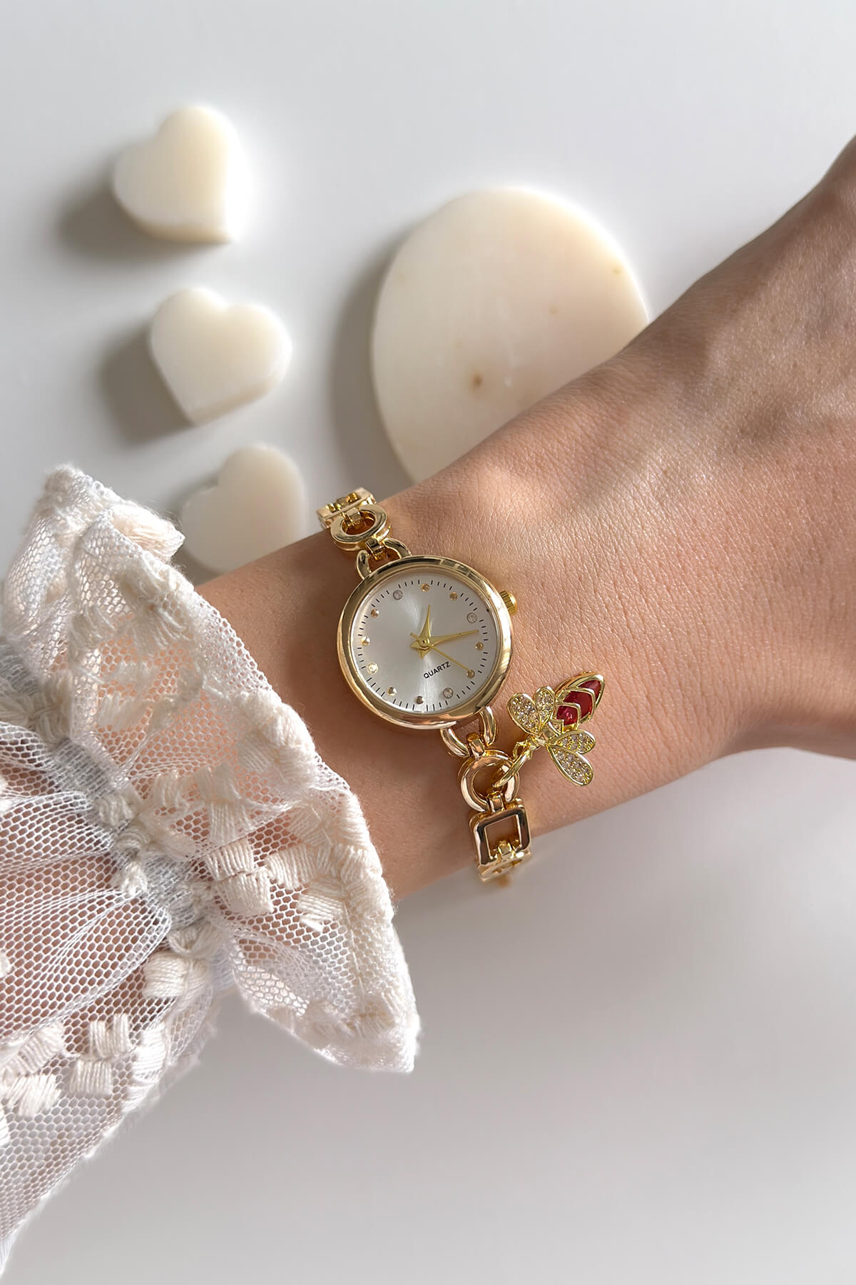 Cappmoda Sia Ekru Kadran Arı Charm Gold Metal Kordon Kadın Kol Saati