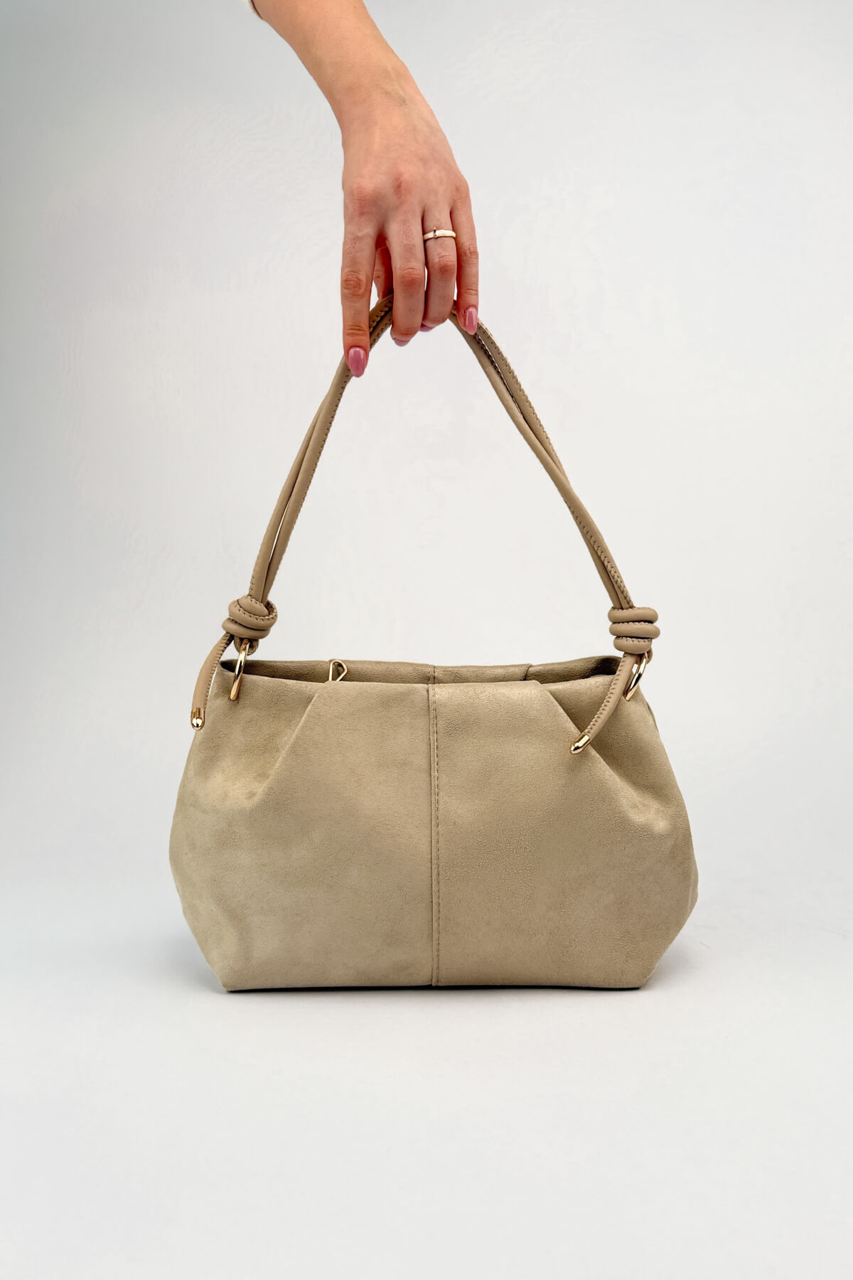 Çanta: Akışkan slouchy form, omuz askısında el işçiliği düğüm detayları ve gold bağlantı halkaları (34x18x12 cm).