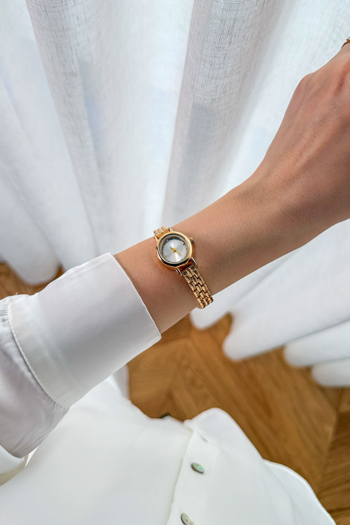 Saat: Vintage esintili küçük yuvarlak kadran, gold metalik örme kordon ve takı şıklığında minimal tasarım.
