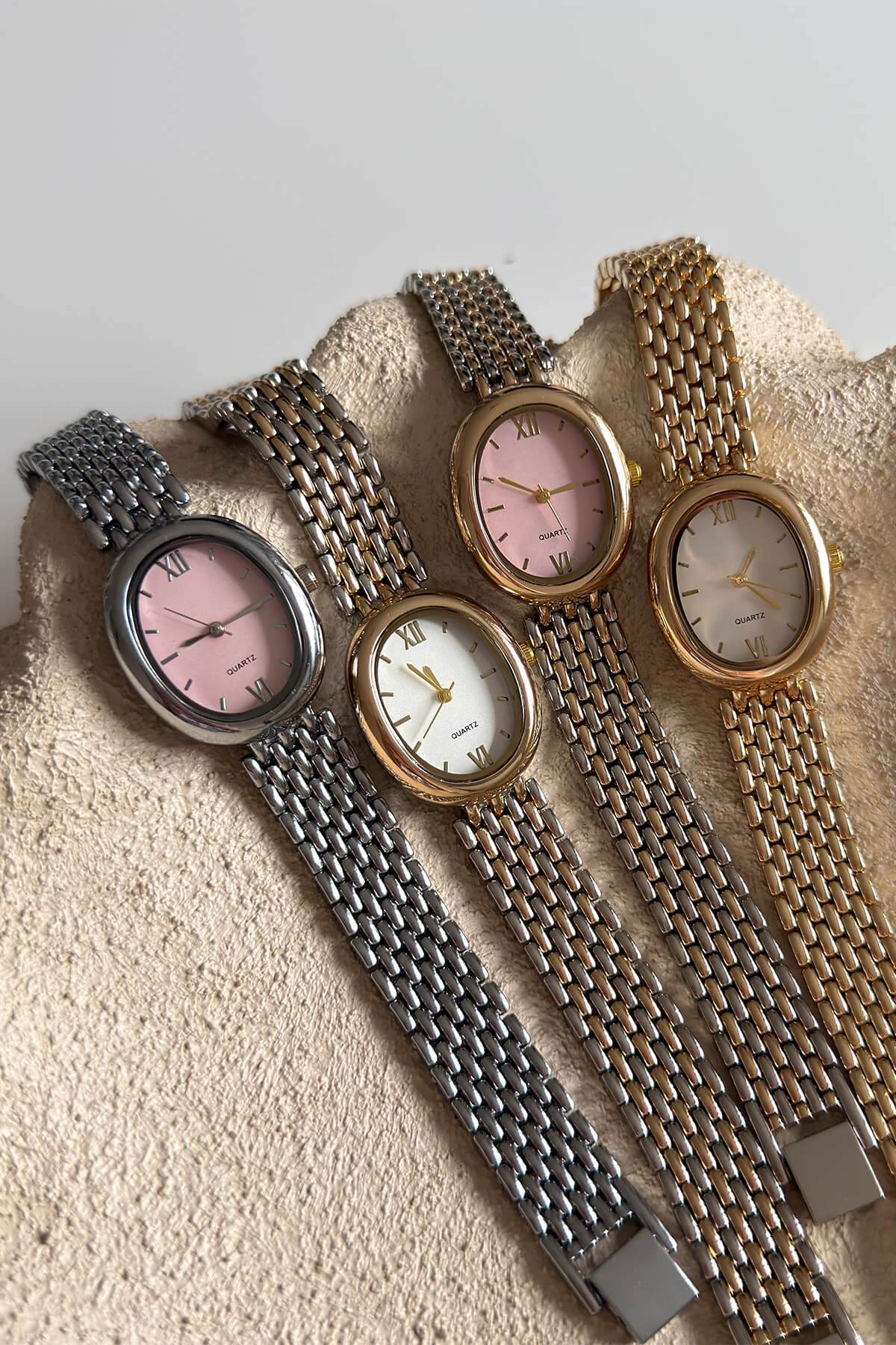 Gümüşün soğuk ve asil duruşunu pembe kadranın romantik havasıyla buluşturan Sierra, naif bir şıklık arayanların tercihi. İnce işçilikle tasarlanmış çoklu baklalı kordon yapısı, saati standart bir aksesuar olmaktan çıkarıp şık bir bileklik formuna sokuyor. Oval kasanın yumuşak hatları ve pastel tonlardaki kadranı sayesinde, her kombine zarif ve feminen bir imza atmanızı sağlar.
