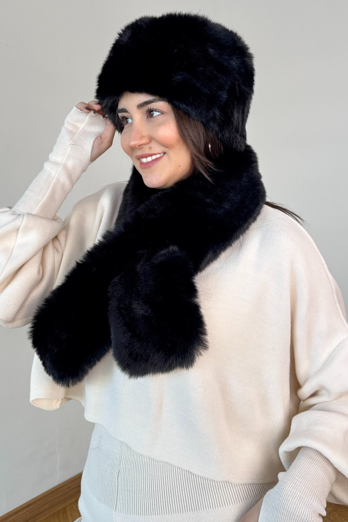 Geçirmeli kürklü şal, yumuşak dokusuyla boyun bölgesini korur ve zarif bir görünüm sunar.