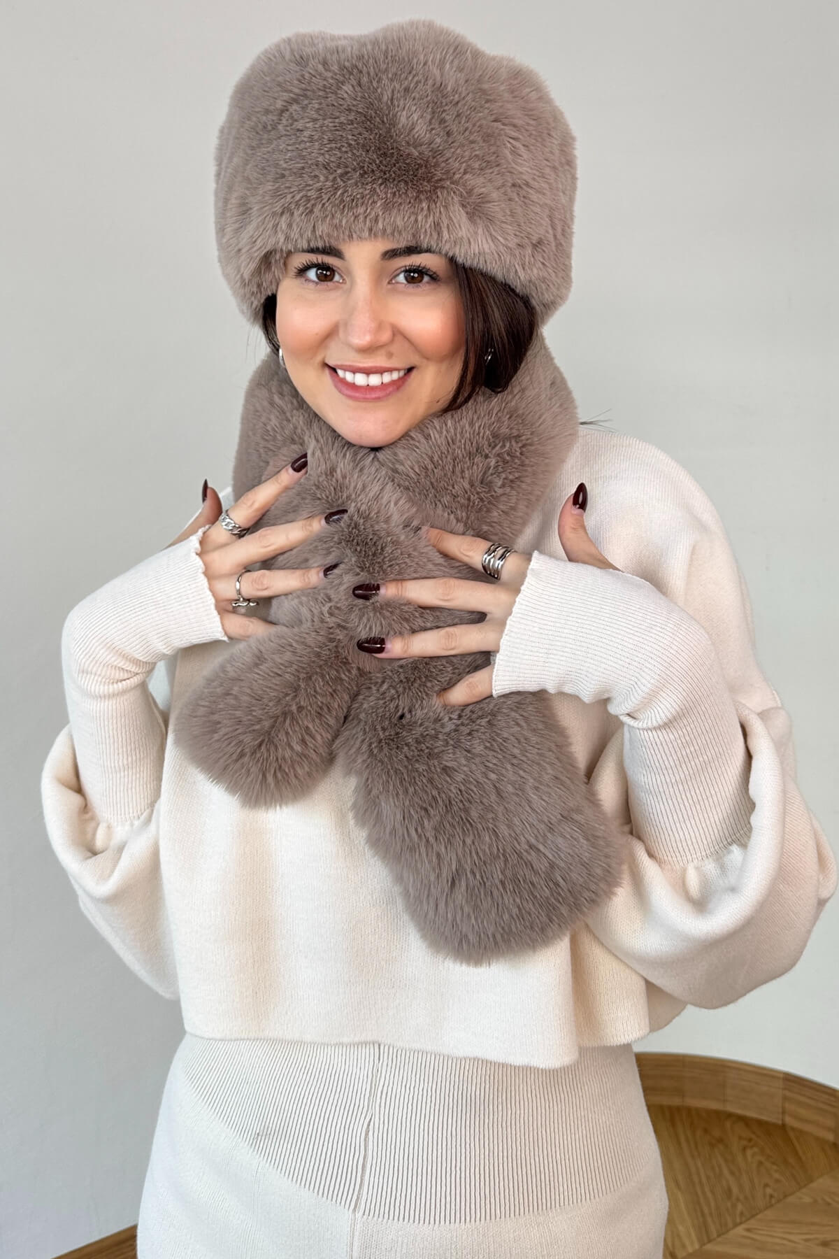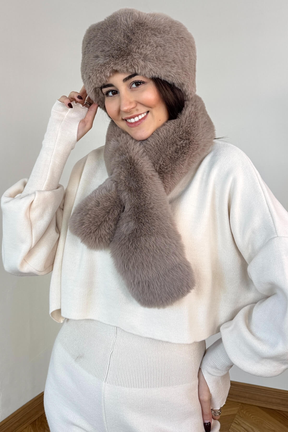 Geçirmeli kürklü şal, yumuşak dokusuyla boyun bölgesini korur ve zarif bir görünüm sunar.
