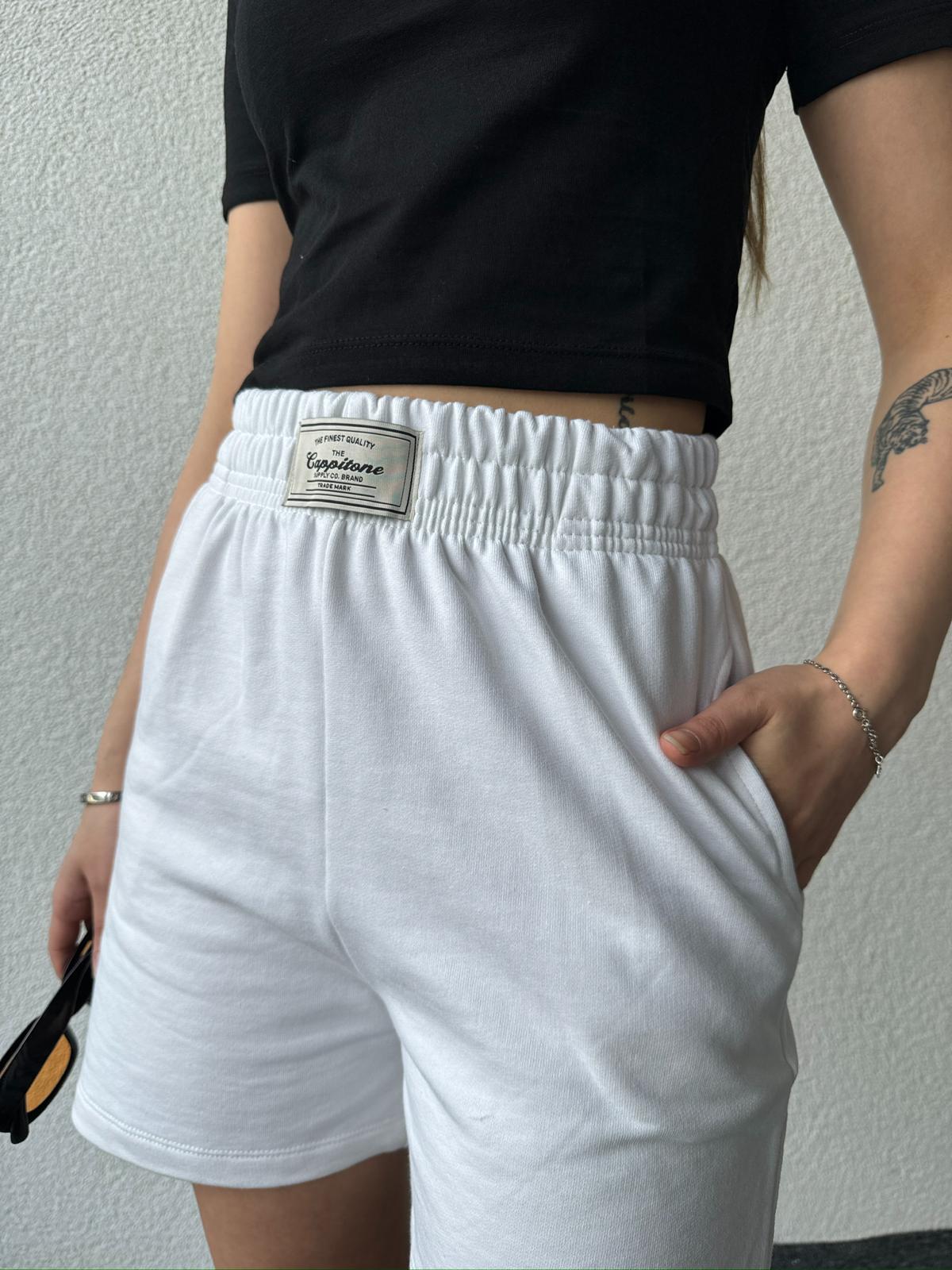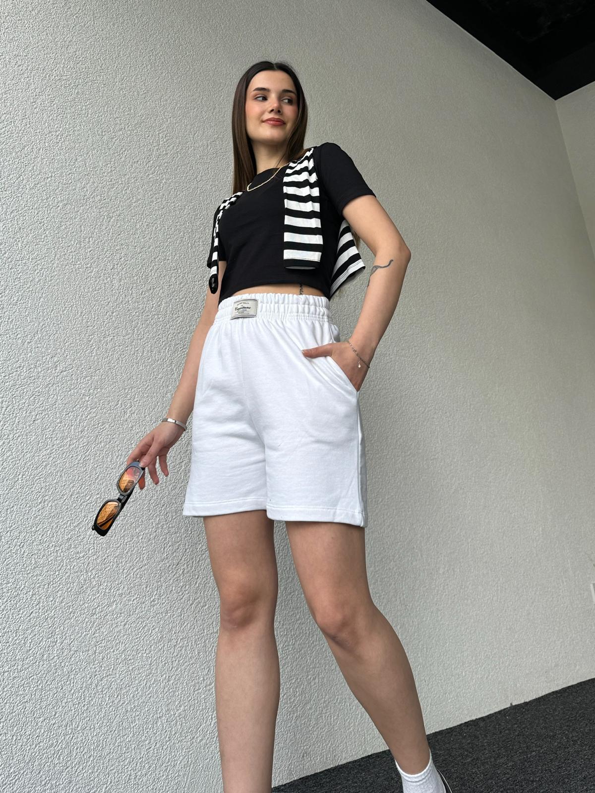 ŞRT-16022 Beyaz Etiket Detaylı Uzun Lastikli Şort