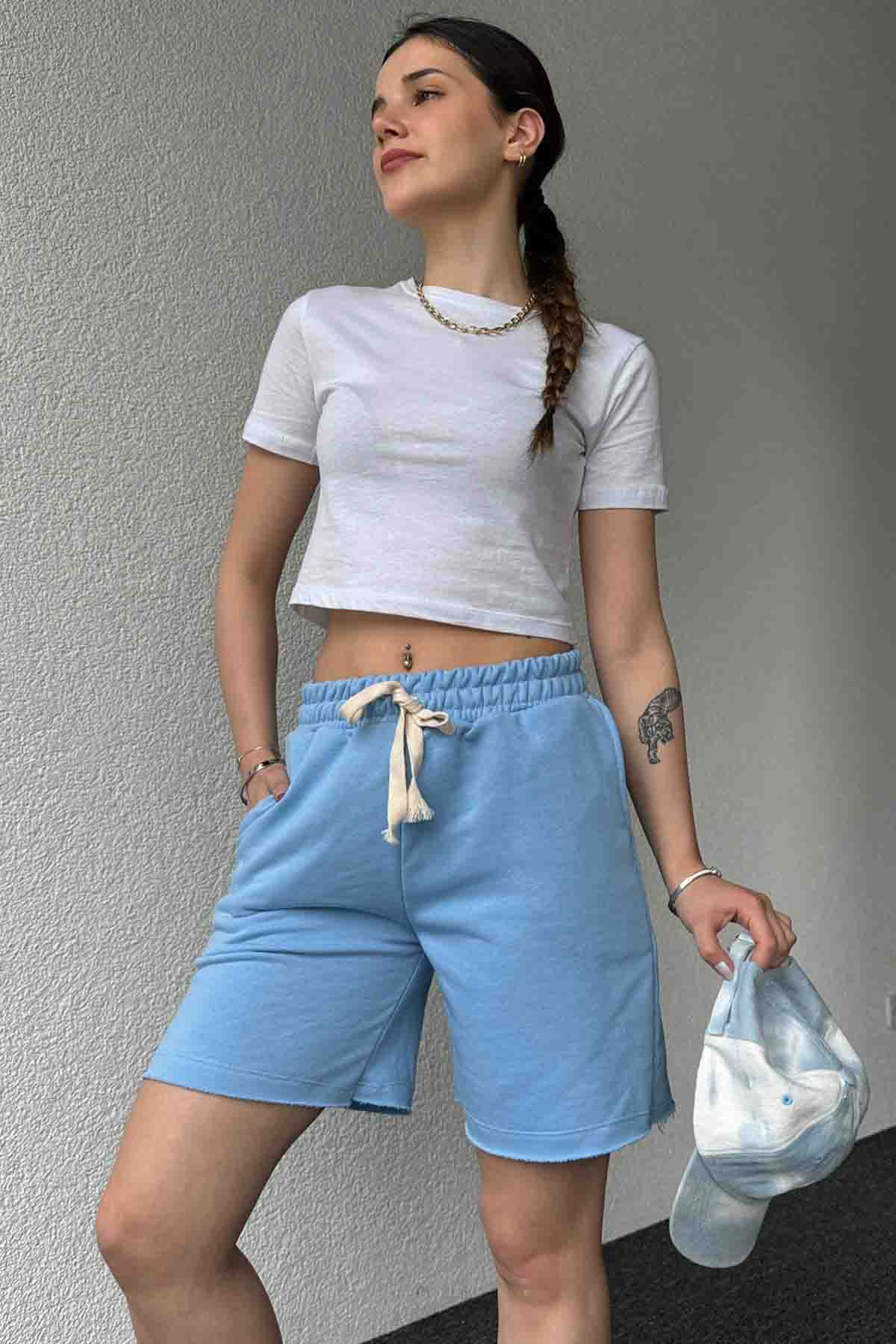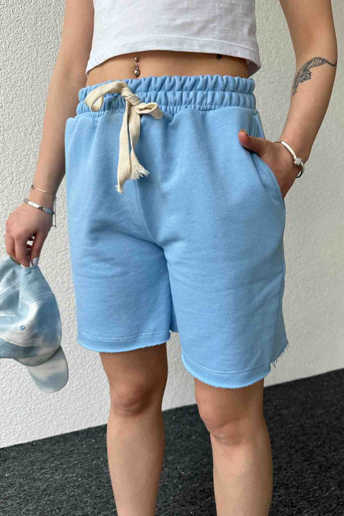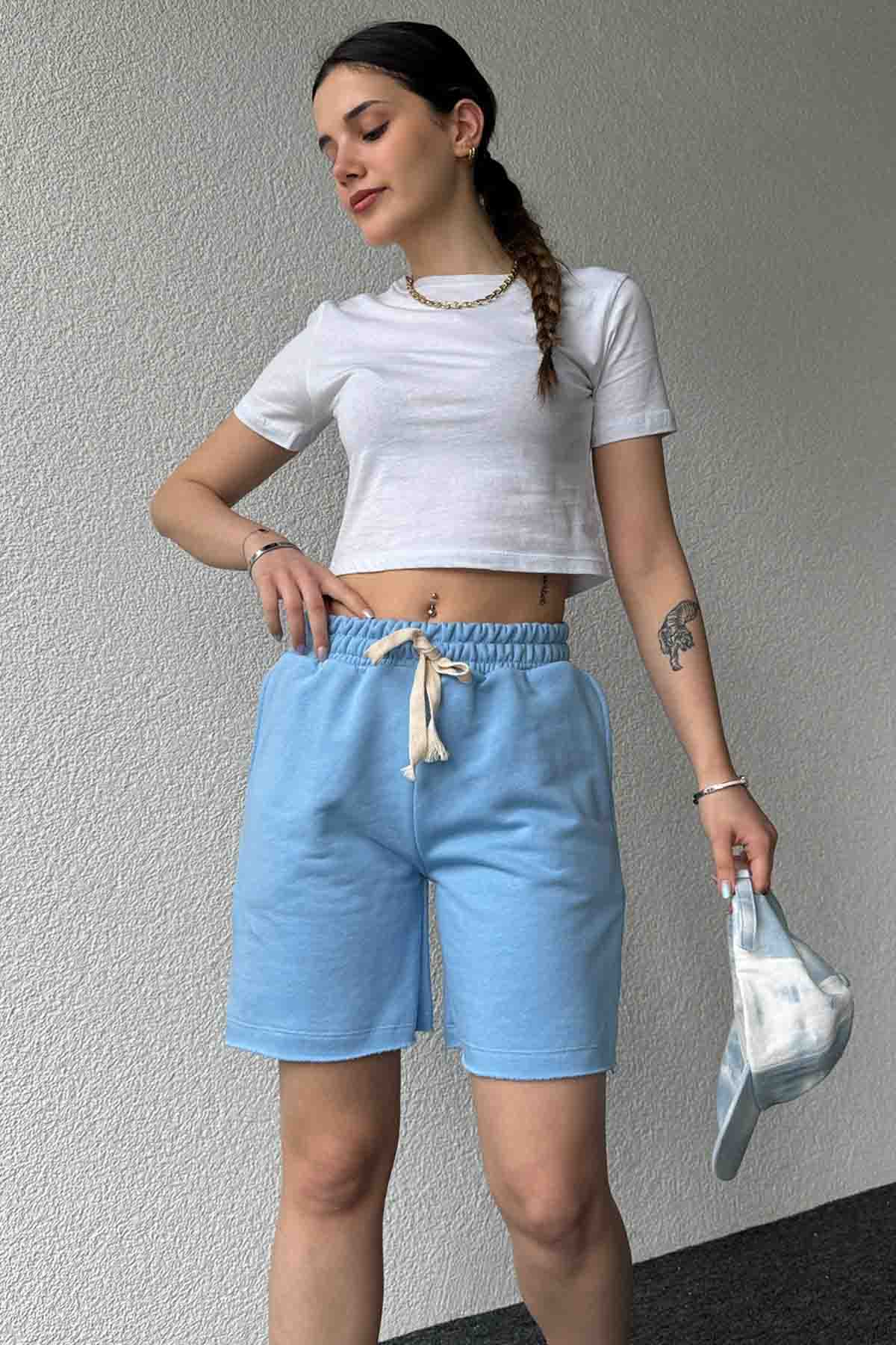 ŞRT-16026 Bebe Mavi Pis Dikişli Kordonlu Uzun Lastikli Şort